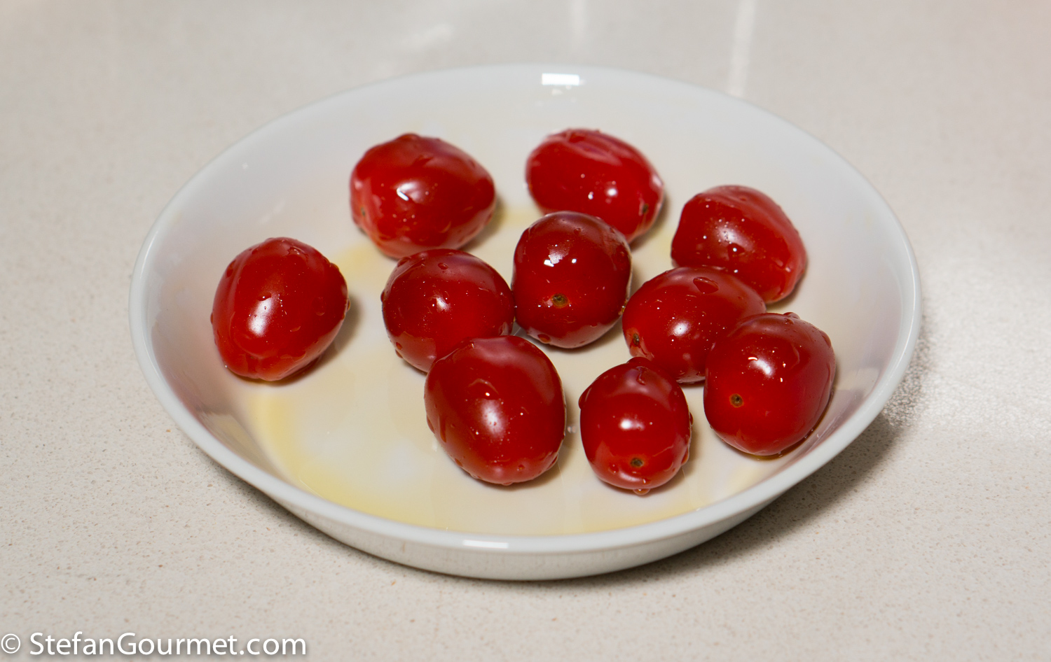 Preheat the oven to 180C/350F. Toss the cherry tomatoes with a bit of olive oil.