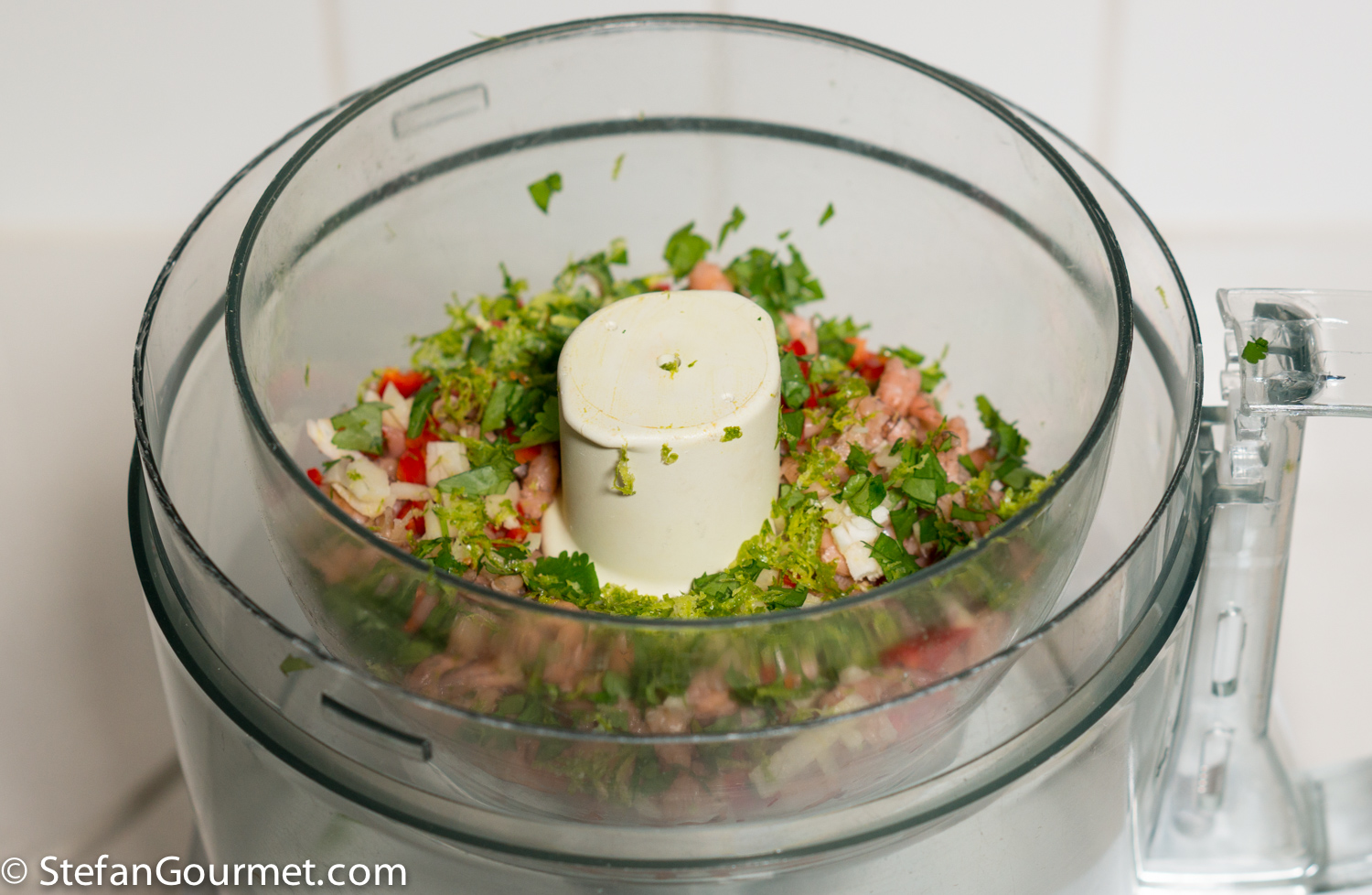 In the meantime, combine the shrimp, coriander, lime zest, chilli, and 1 minced clove of garlic in the bowl of a blender.