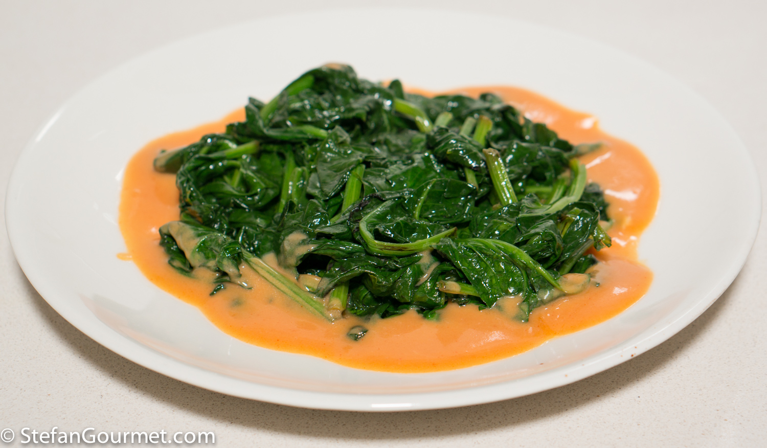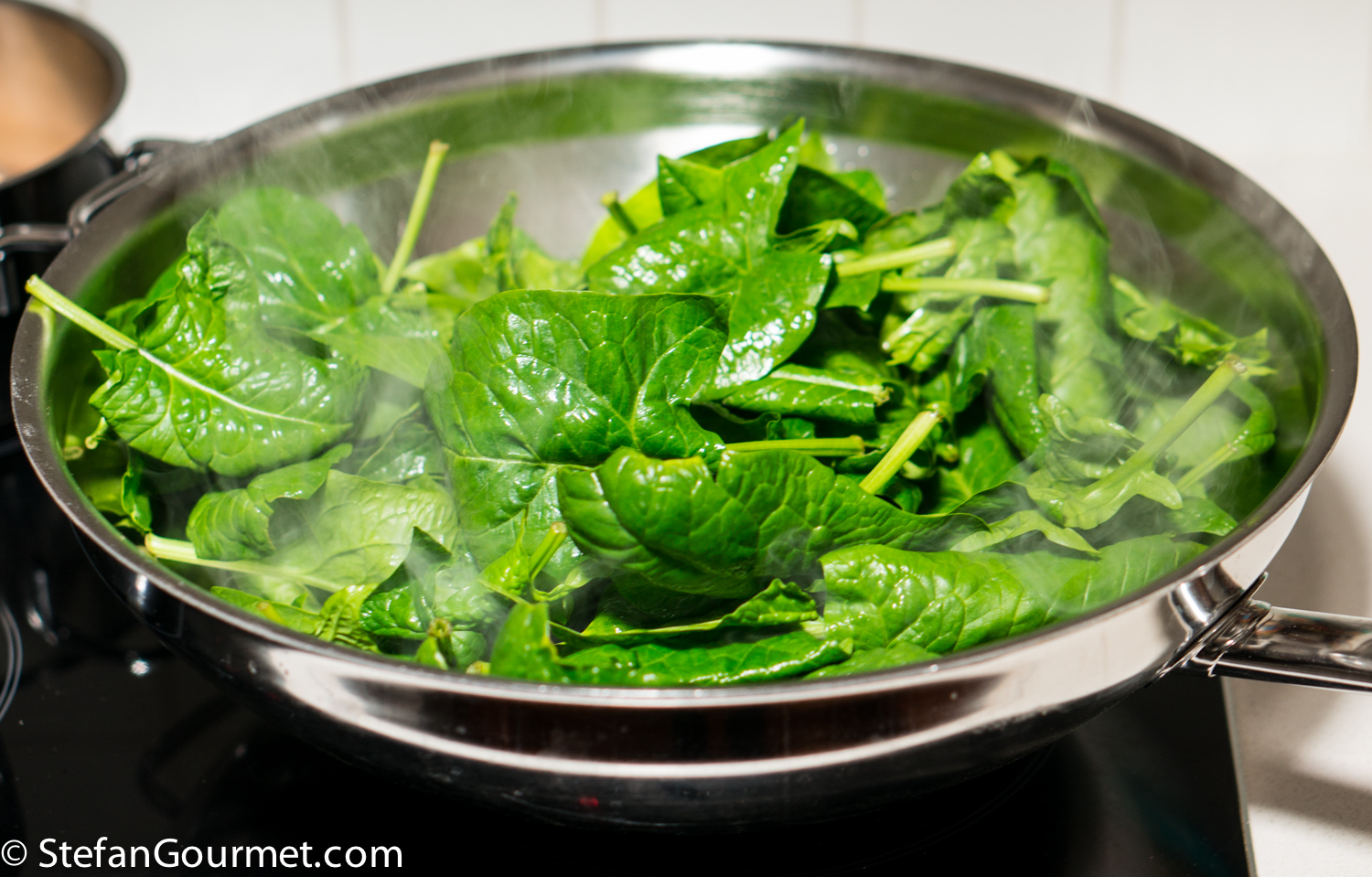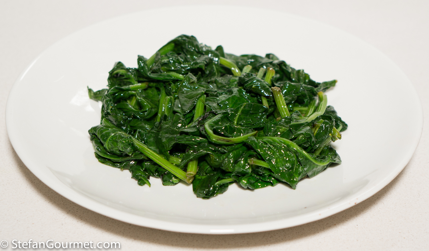 400 grams (.9 lb) spinach, preferably ‘wild’ spinach (i.e. the opposite of ‘baby’ spinach with tougher leaves suitable for stir-frying)