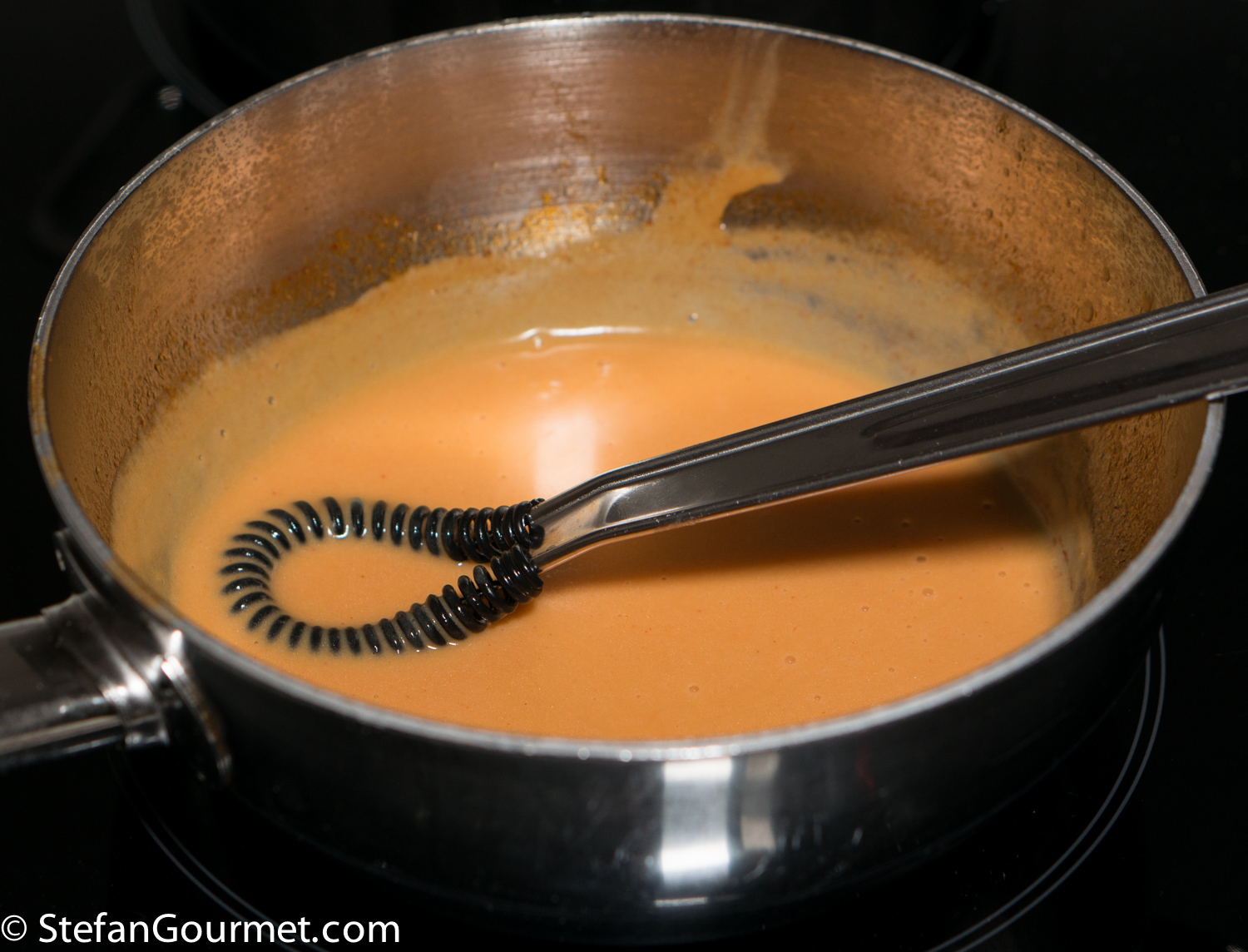 My long-time blogging buddy Paul of That Other Cooking Blog pointed out in his latest post that cooking order is important. This is one of those dishes in which that is the case, because you want to serve all the different components perfectly cooked and hot at the same time. This can be a challenge, especially with a sauce that can curdle easily like the sauce used in this recipe. It helps to use preheated plates, so at least the food doesn’t get cold while you are plating (and photographing) it. In this case it also helps to finish cooking the fish in the oven, but timing is important because leaving it in the oven for too long will result in dried out fish.