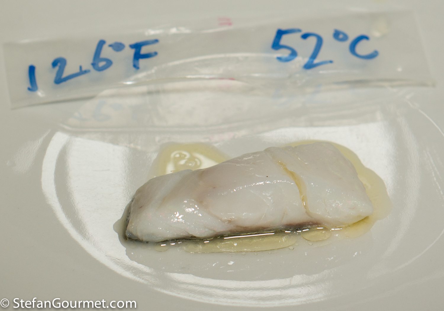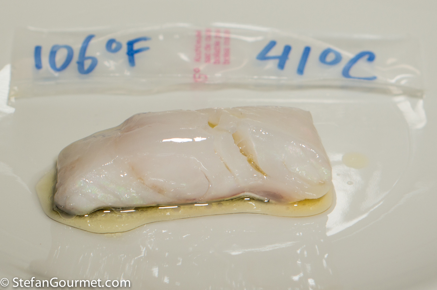 Then I vacuum sealed the four pieces individually, each with a tablespoon of good extra virgin olive oil. I labeled the bags with the cooking temperatures, and cooked the cod at each temperature for 30 minutes.
