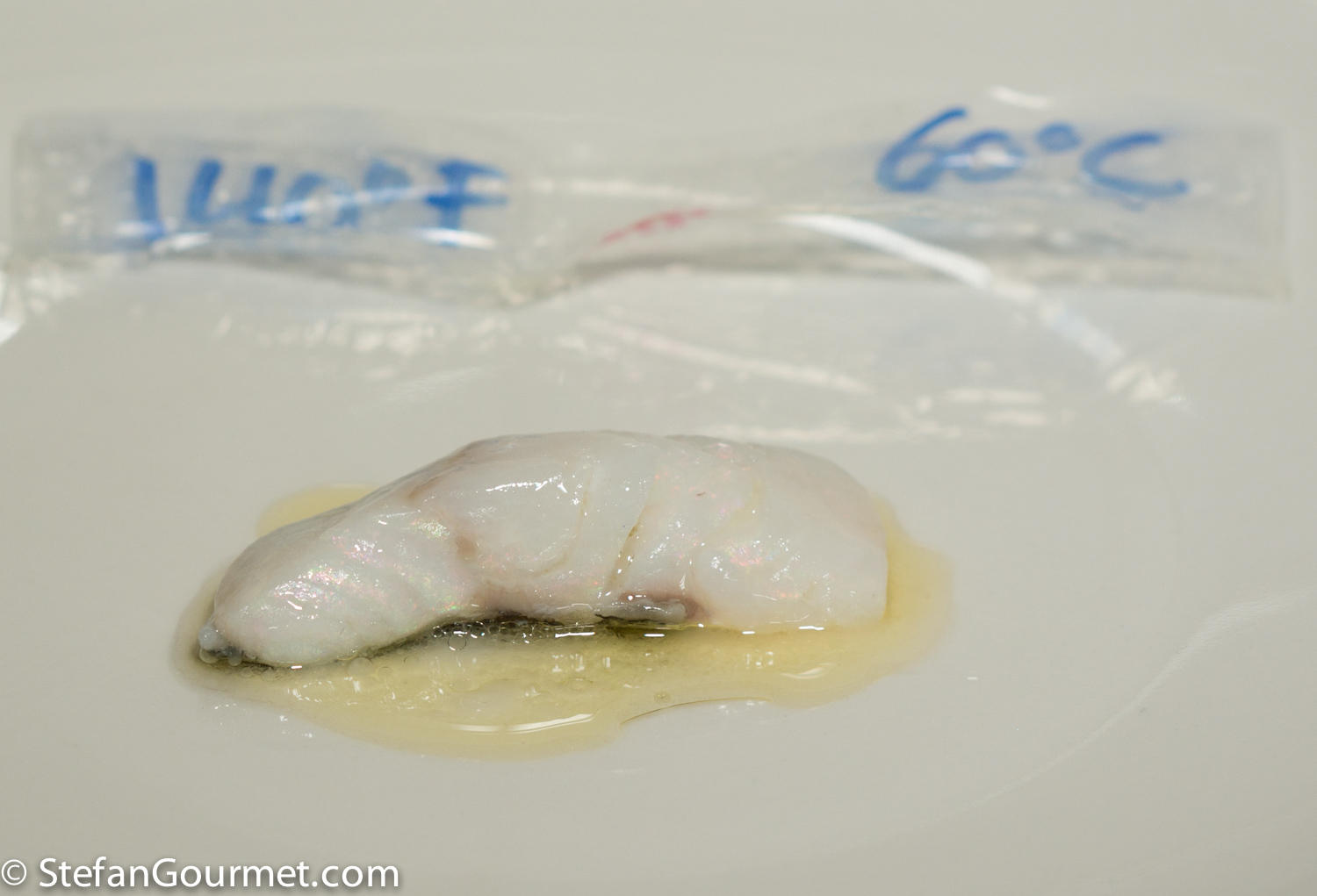 And finally, at 60C/140F, the cod is starting to get quite dry, but due to the olive oil it is still acceptable. It has more bite.