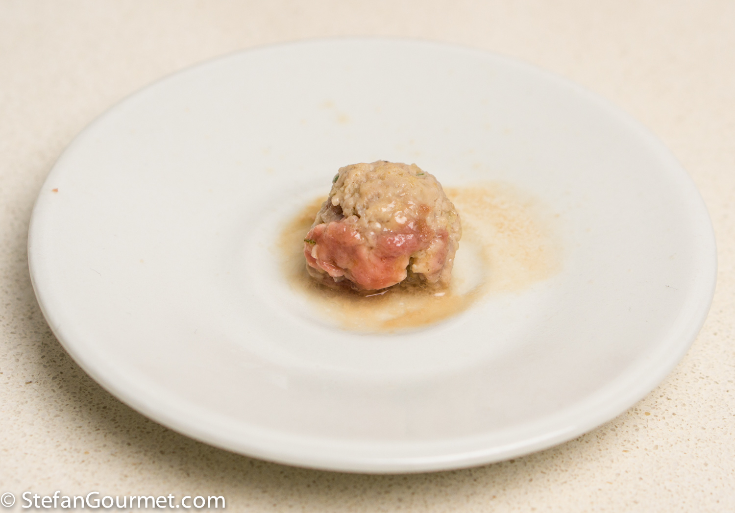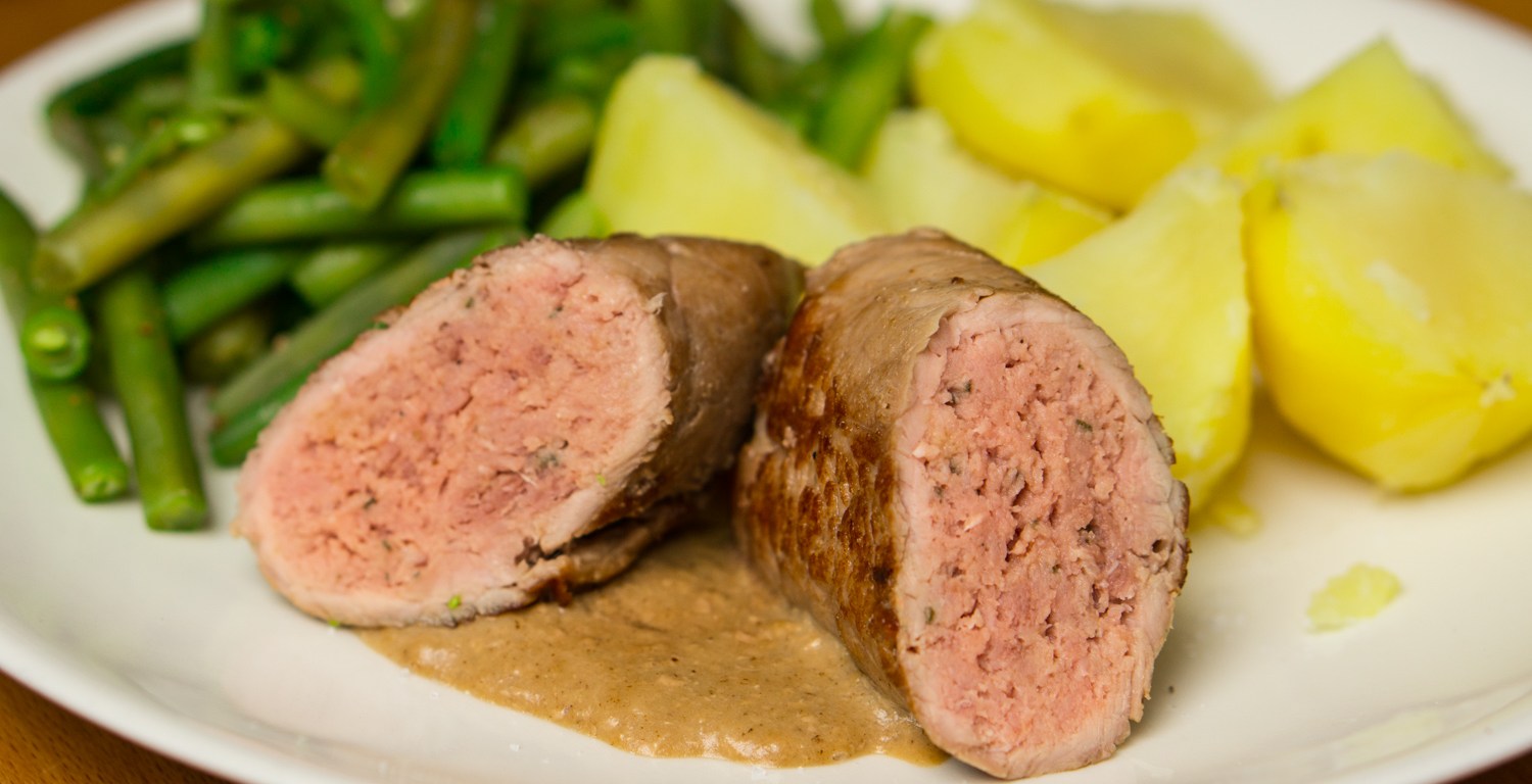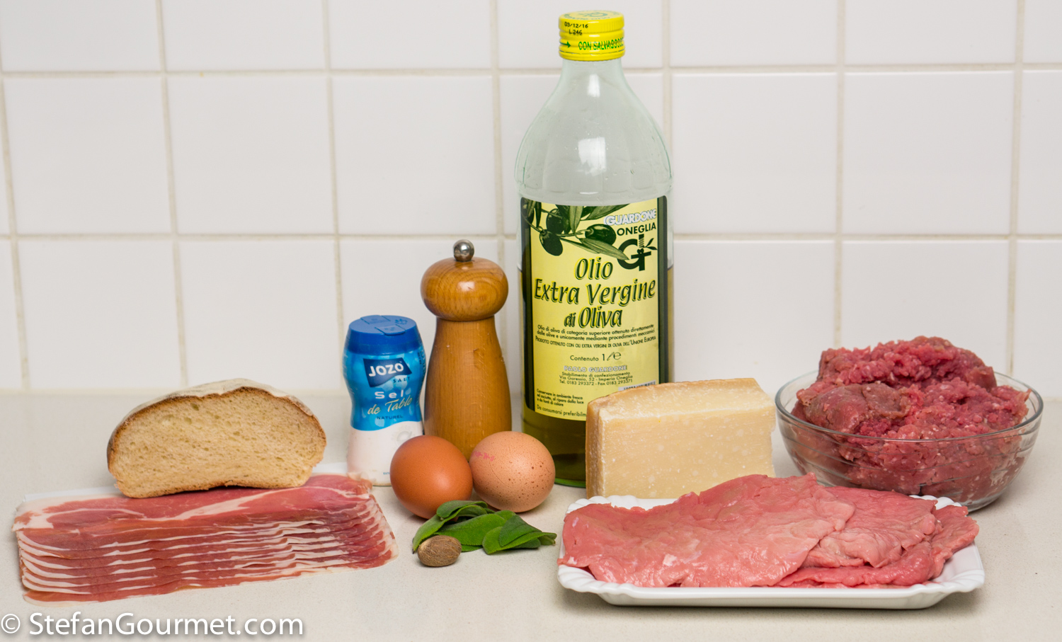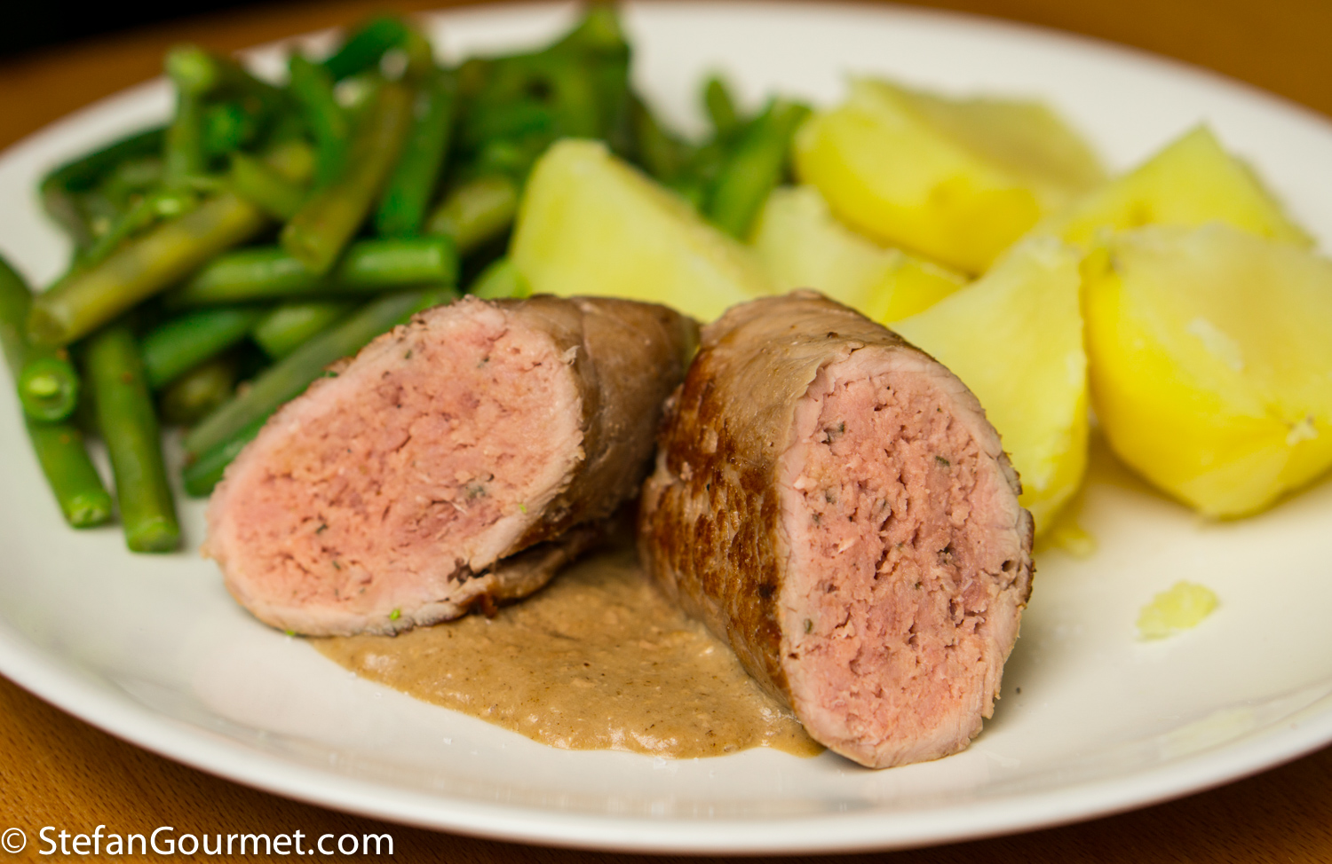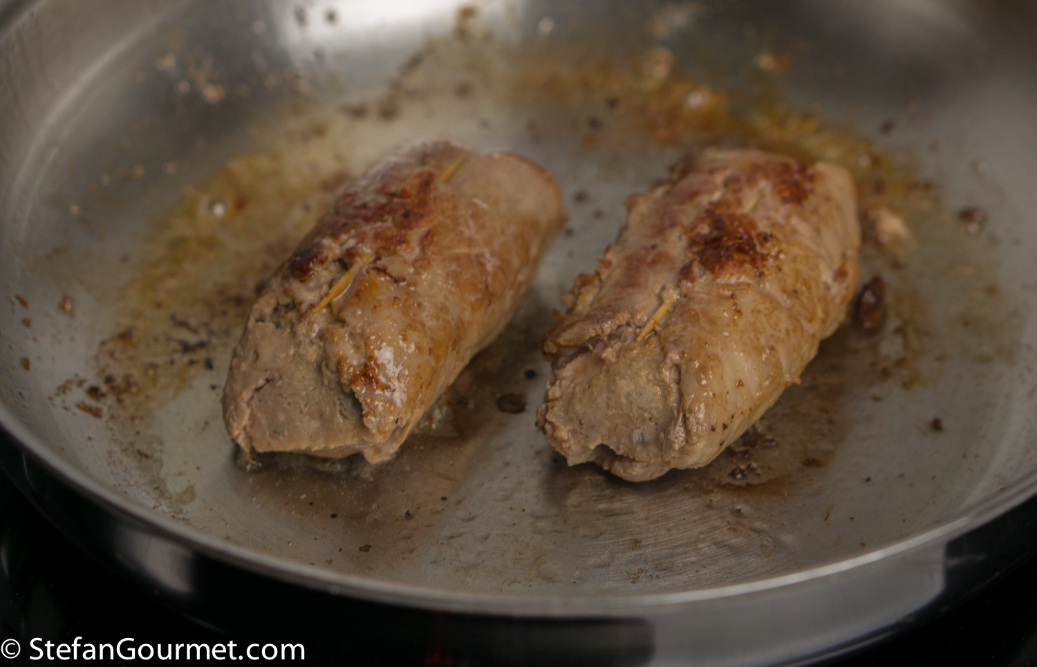 This is an Italian version of what is known in the Netherlands as kalfsvinken: a thin slice of veal stuffed with ground veal. It becomes Italian by the addition of prosciutto, parmigiano, sage, and nutmeg. The easiest way to cook these perfectly is of course sous-vide, but you can just as easily finish them in the oven. The most important part is to make sure the meat does not dry out.