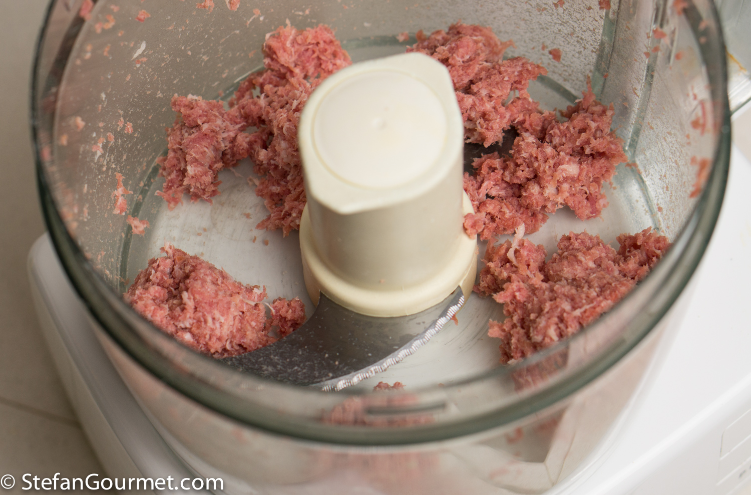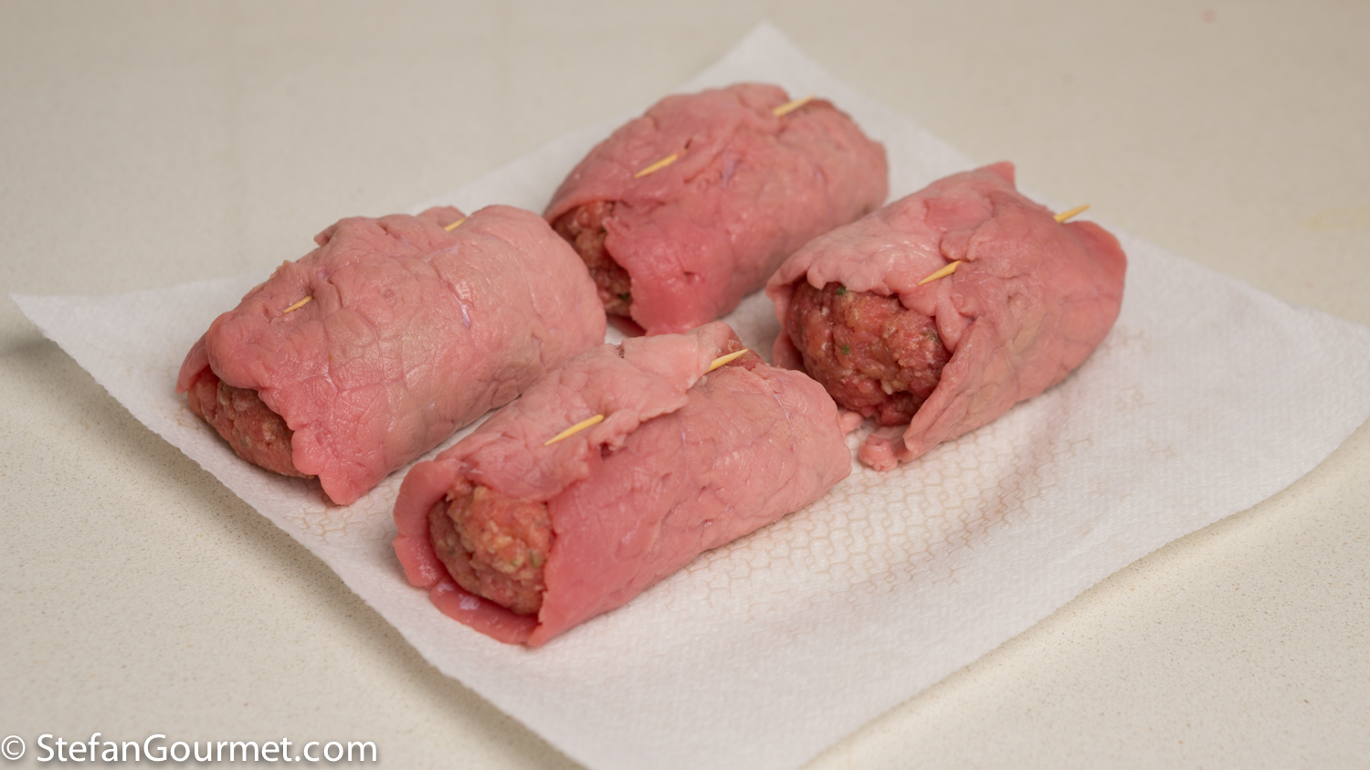 Divide the ground veal mixture into four equal portions and shape them into a fat sausage. Wrap a slice of veal around each ‘sausage’ and secure with a toothpick.