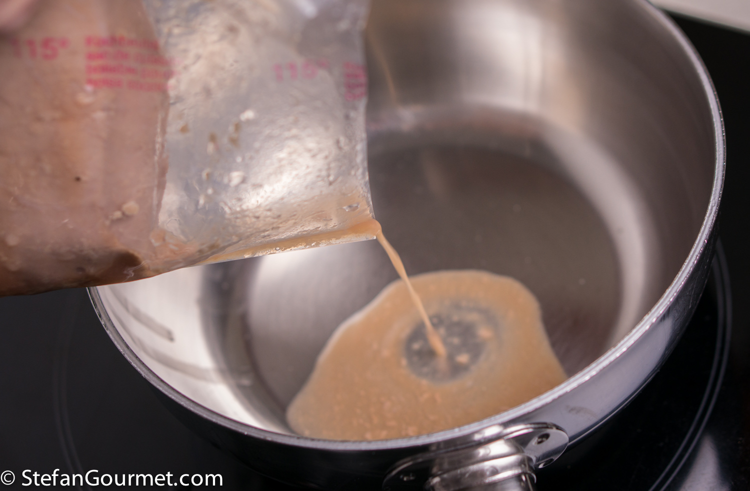 After cooking sous-vide, cut open the bag and pour the juices into a saucepan.