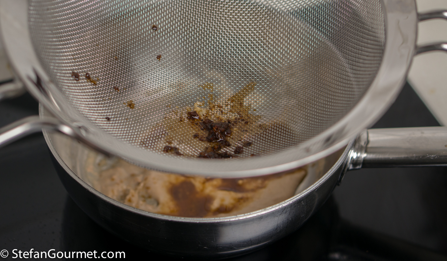 Sieve the sauce from the frying pan into the saucepan with the bag juices.