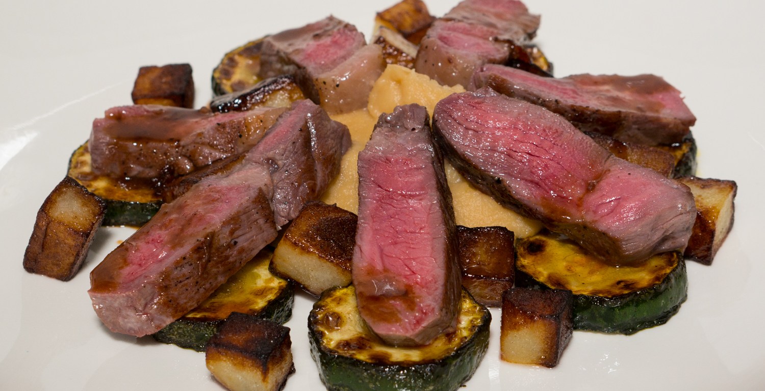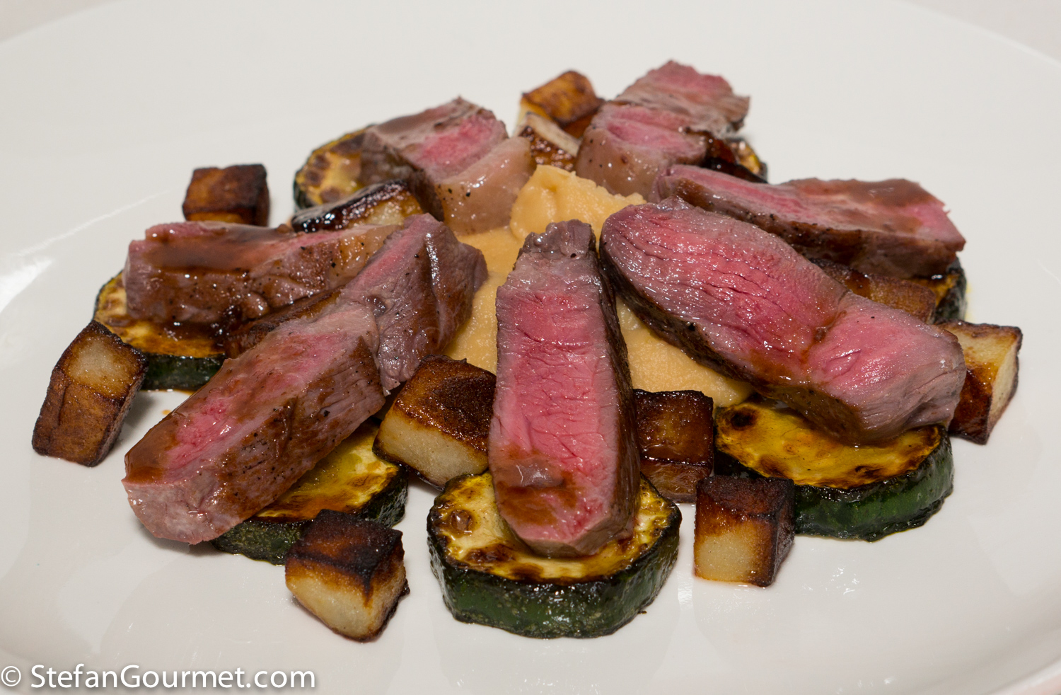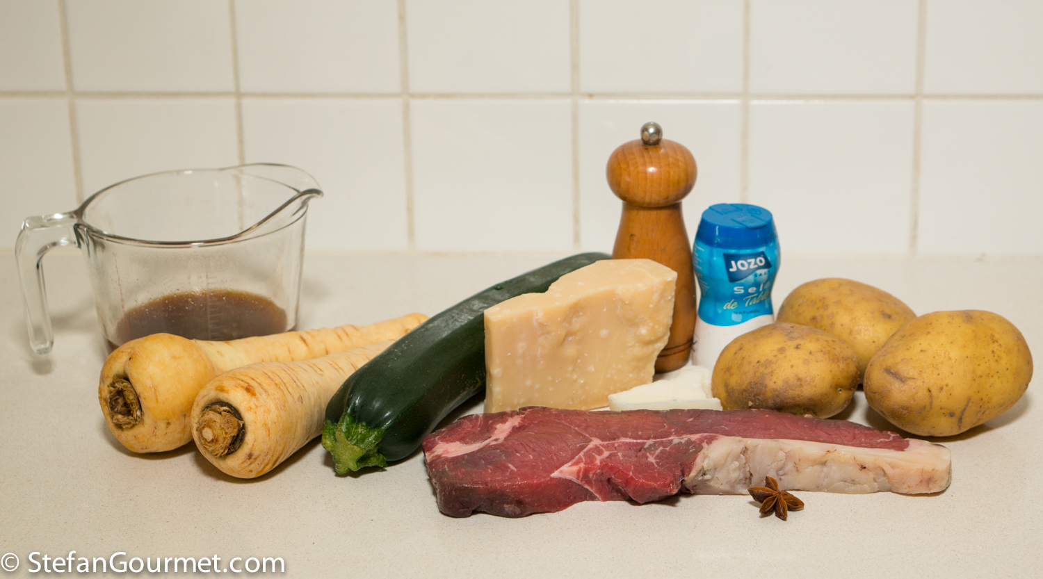 My old-fashioned butcher (which is not a bad quality at all in a butcher) is slowly catching up to new trends, and is now dry aging beef. I picked up a dry aged strip steak (called entrecote in the Netherlands) and decided to use what I had that needed to be used up to create a dish. This happened to be some parsnips, a zucchini, and some potatoes. Here is what I did…