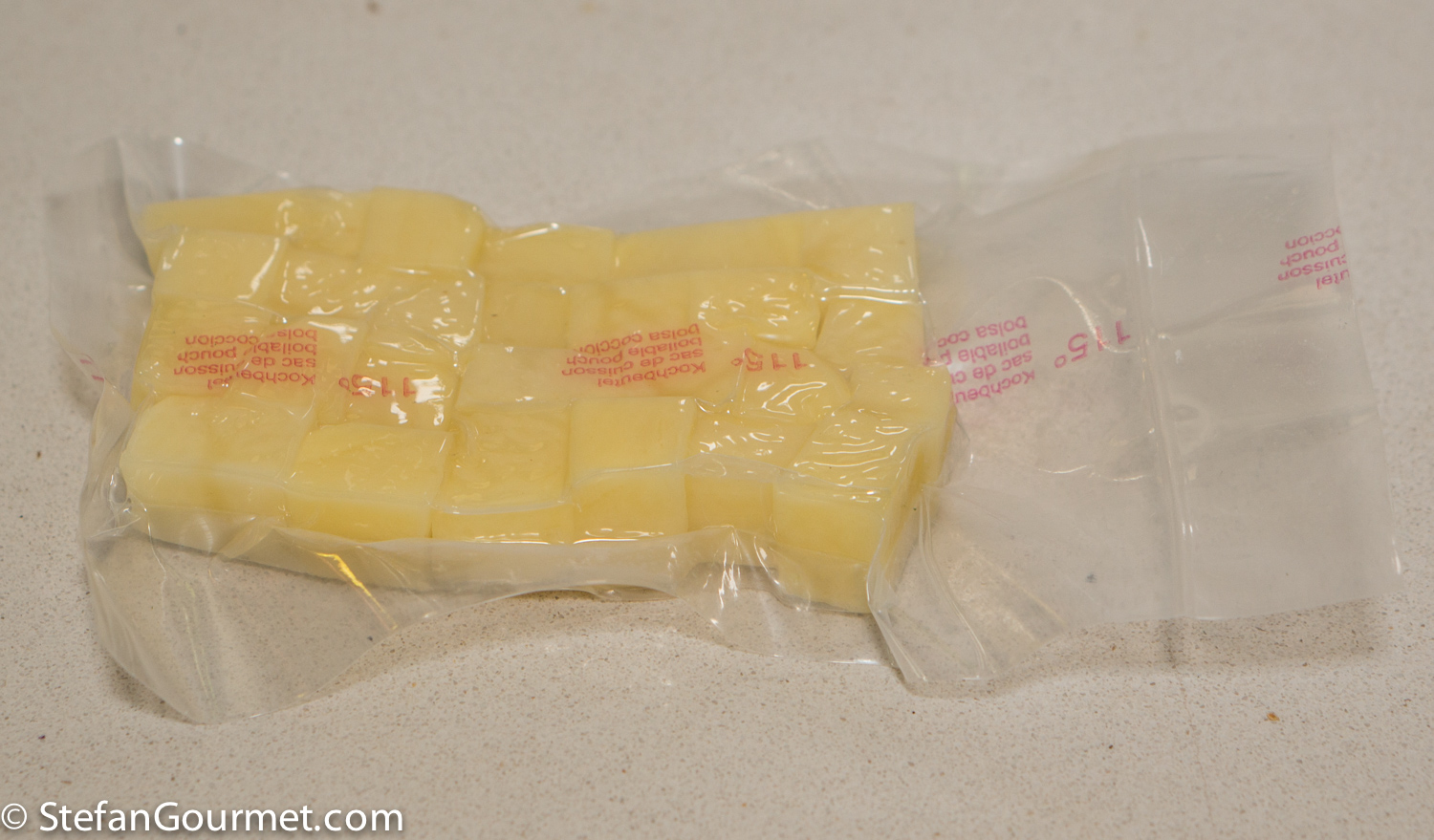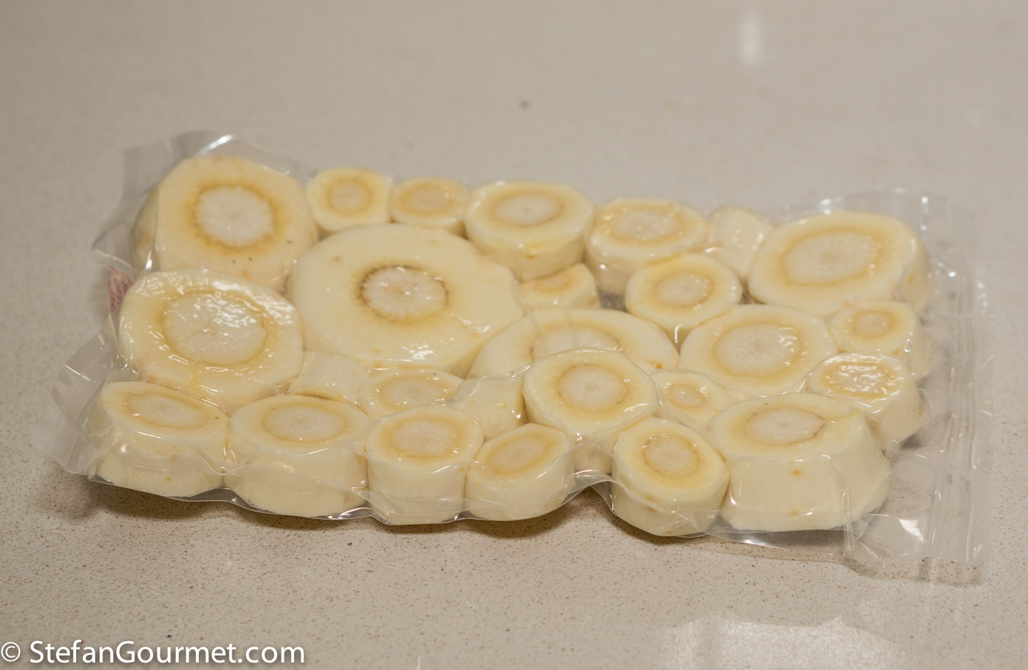 The advantage of owning two sous-vide devices is that you can cook stuff sous-vide at two different temperatures simultaneously. So I decided to cook the parsnips and the potatoes sous-vide as well. I peeled the parsnips, cut them into slices, and vacuum sealed them.