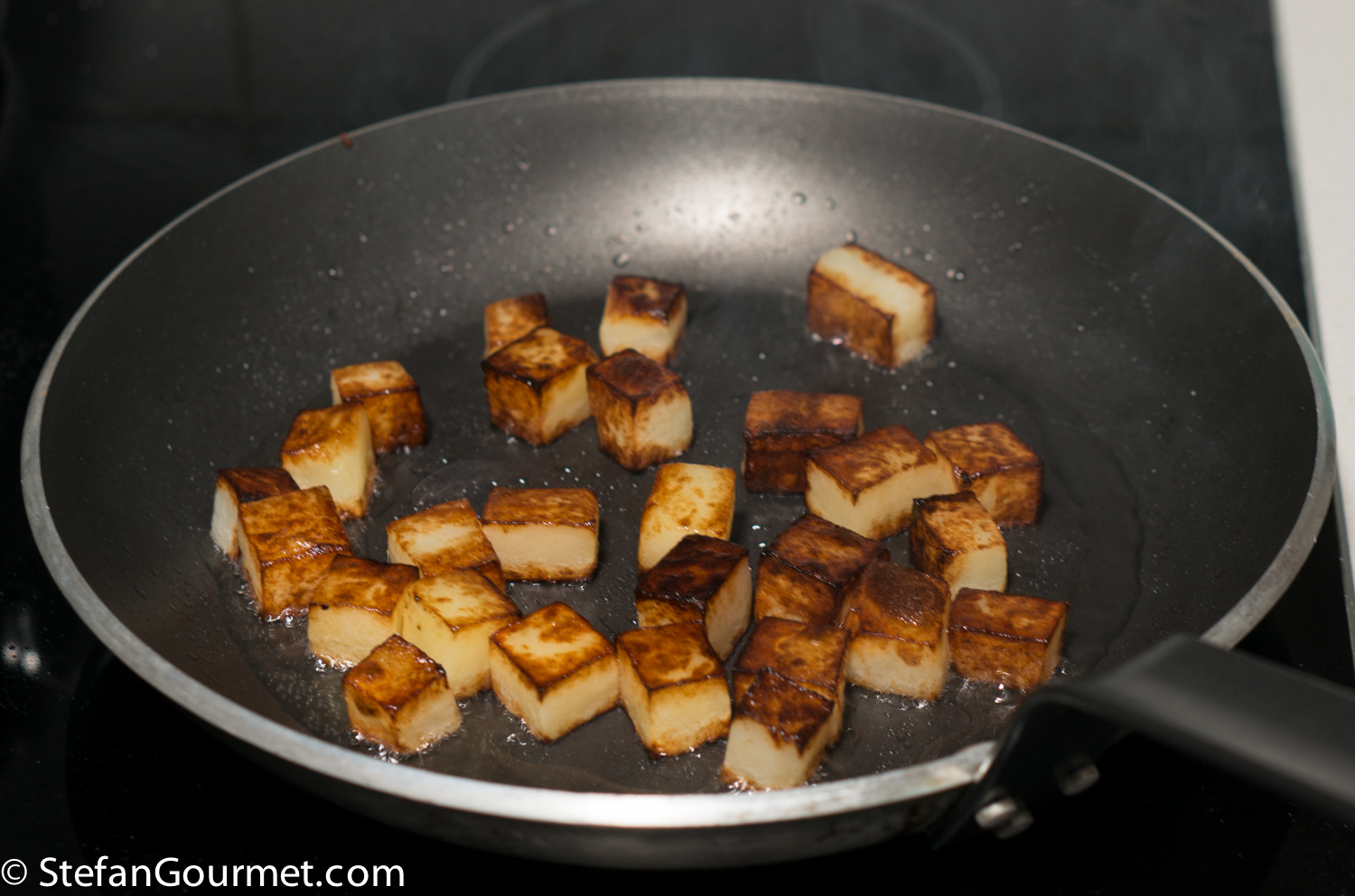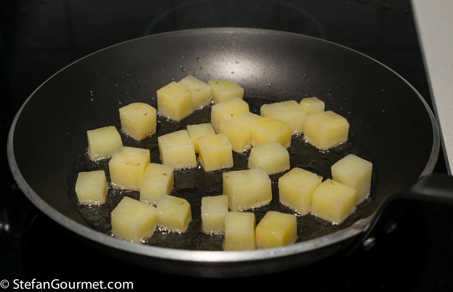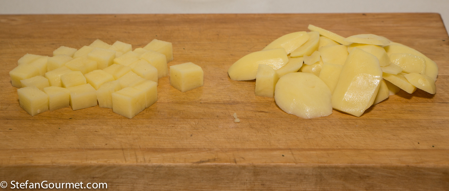 I peeled the potatoes, cut them into cubes because I thought that would look nice, and reserved the remaining potato scraps to make mashed potatoes the next day. (Too bad potatoes aren’t square, as that would make it a lot easier to cut them into cubes!)