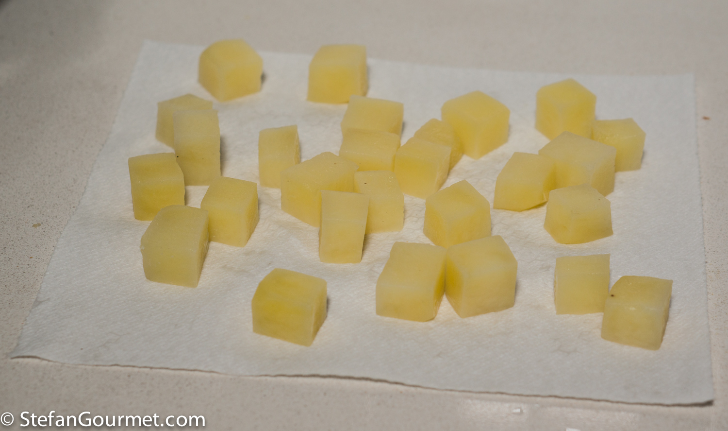 When the potato cubes were cooked, I took them out of the bag and patted them dry with paper towels.