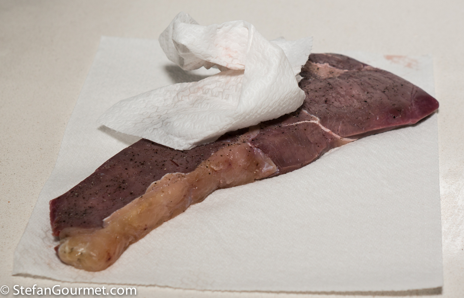 When the strip steak was finished ‘warming’, I took it out of the bag and patted it dry with paper towels.