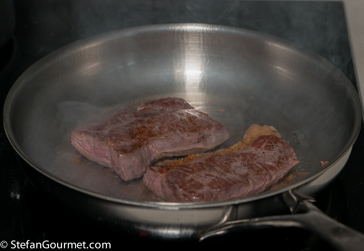 Then I browned it quickly in a frying pan with some rendered beef fat over very high heat (use vegetable oil or clarified butter if you don’t have rendered beef fat). This should only take 30 seconds to 1 minute per side, to keep the steak medium rare. (If you like your steak well done, you are visiting the wrong blog…)