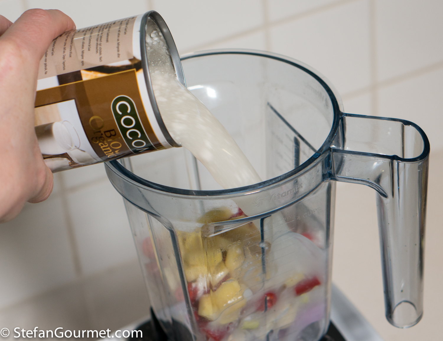 Put the chopped aromatics in a blender and add the remaining thin coconut milk.