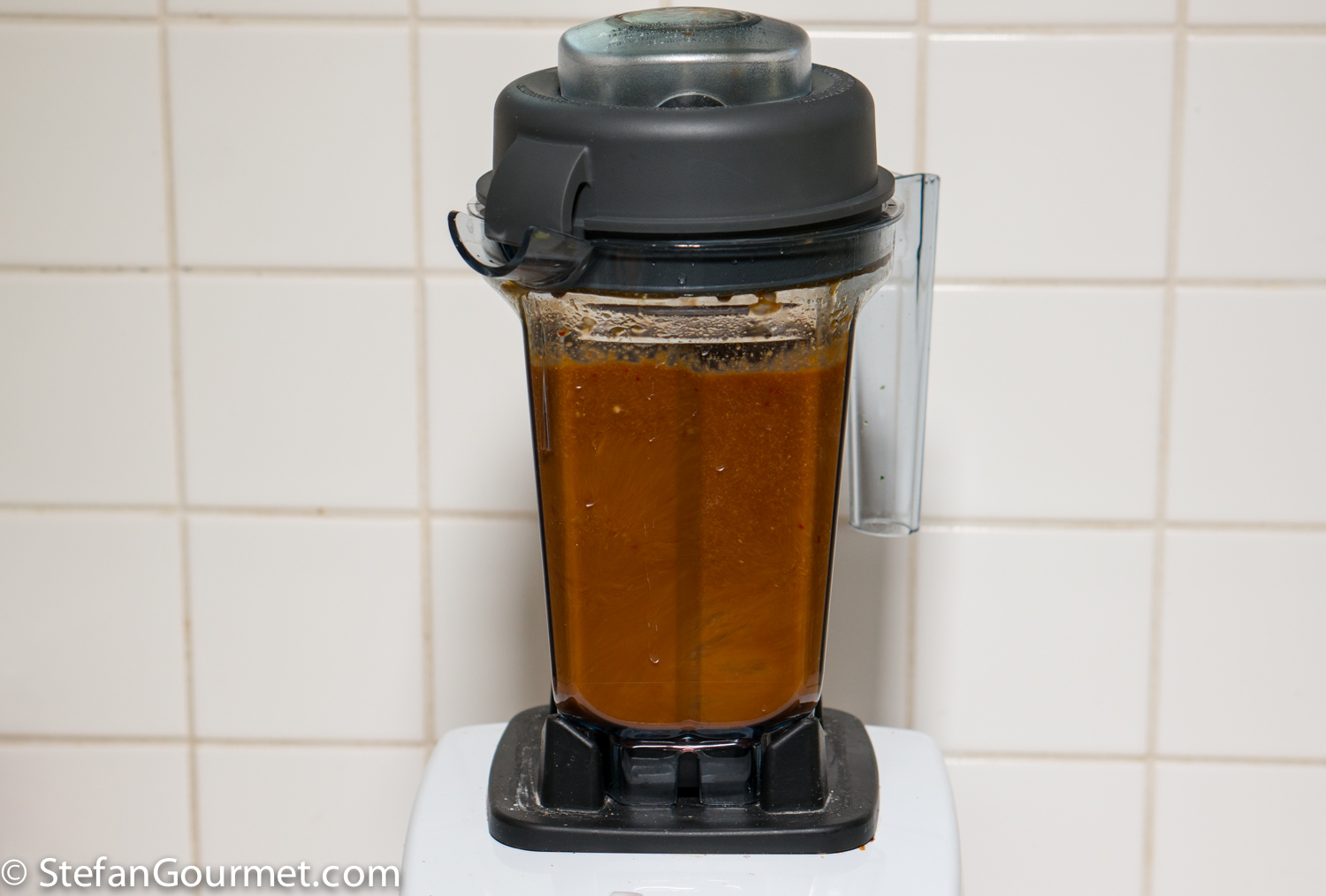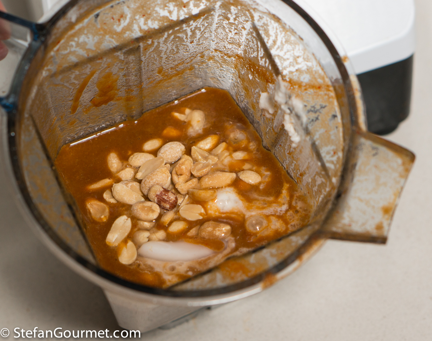 To make the peanut sauce, put the marinade in a blender together with the reserved coconut cream and 100 grams of roasted peanuts.