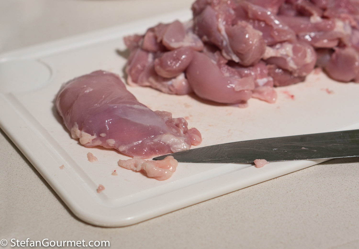 Cut a kilo of chicken thighs into chunks, trimming the fat.
