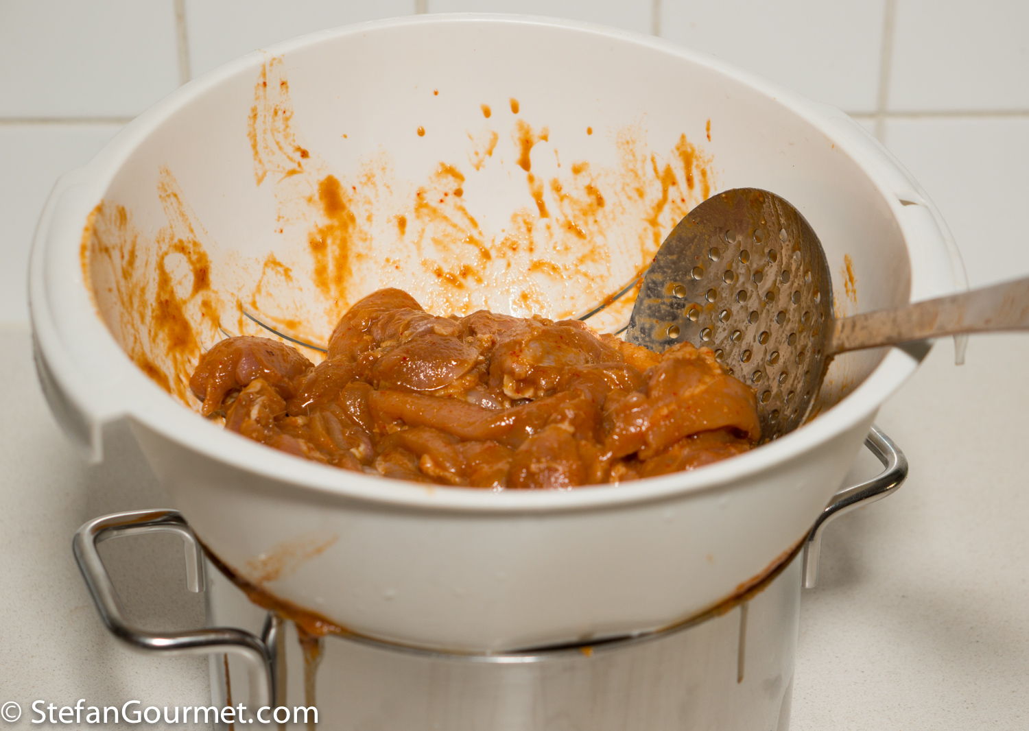 Drain the chicken in a colander, reserving the marinade. Stir the chicken in the colander to help the marinade to drain away.