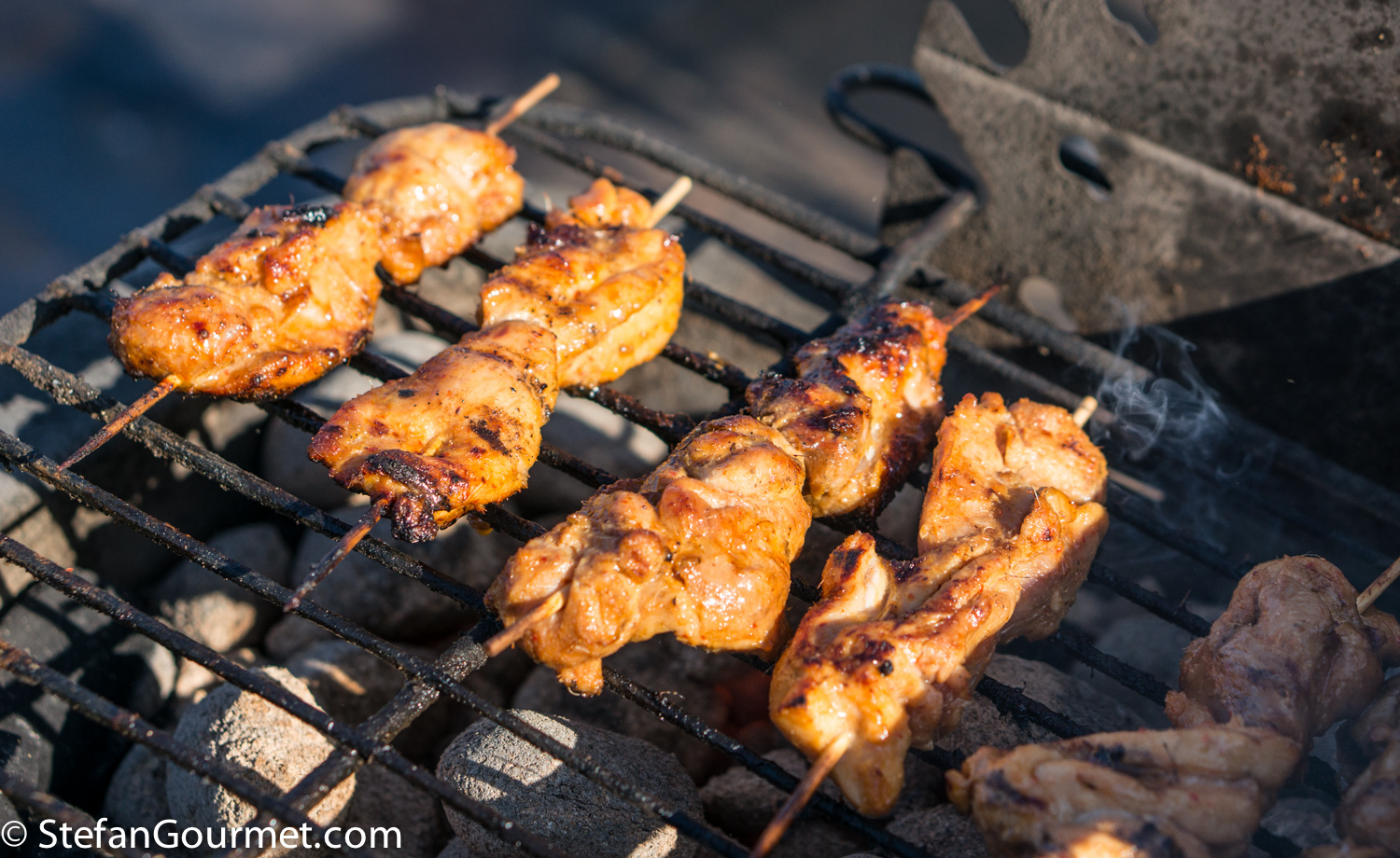 Vive la difference! In Asia and Australia sate skewers are always served dry just off the grill flame with a spicy sauce on the side. I regard them as a another delightfully tasty street food available say on a walk on Singapore harbourfront or at any market or almost any hotel swimming pool as a ‘bite to have’ in between and betwixt! Personally I oft serve them with that first drink or three at a barbecue whilst waiting for the main items. To me your dish, I am certain quite delicious, is one of chicken kebabs . . . as I said, geography and culture do make a difference 🙂 !