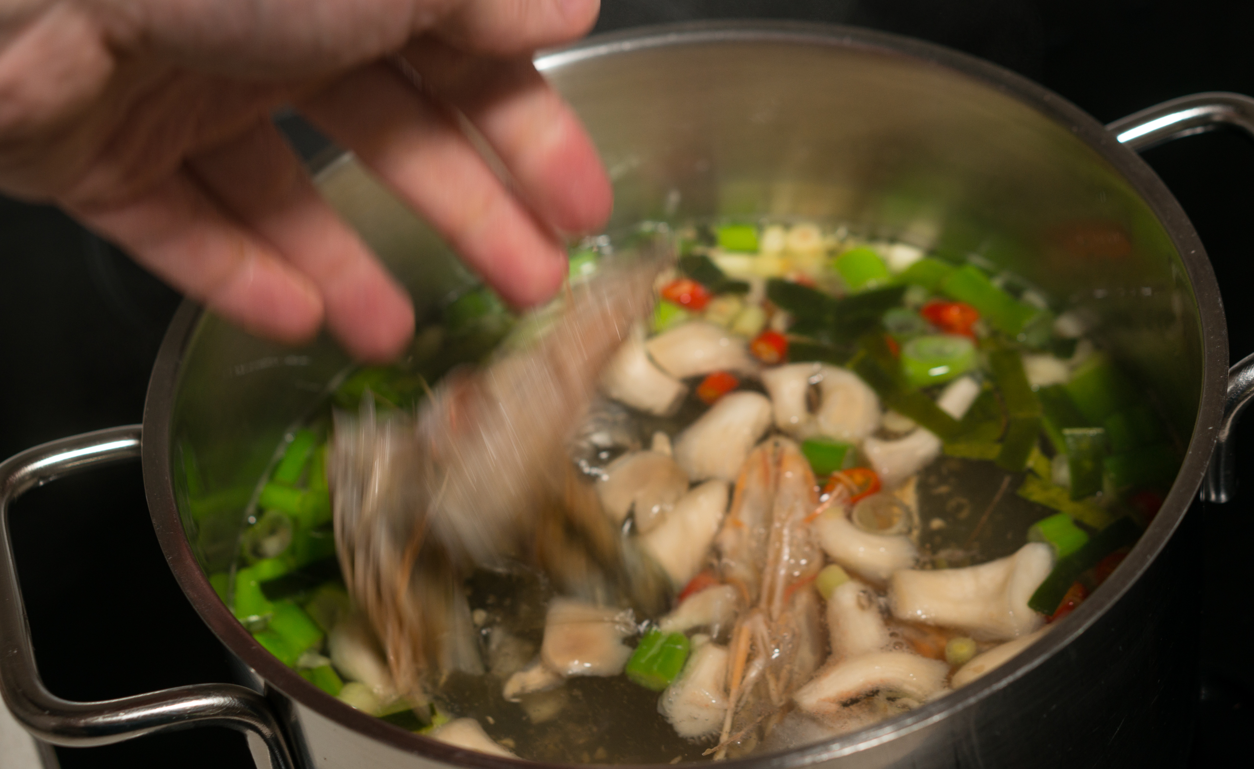 Allow the shrimp to steep in the hot soup until just cooked through, about 3 minutes.