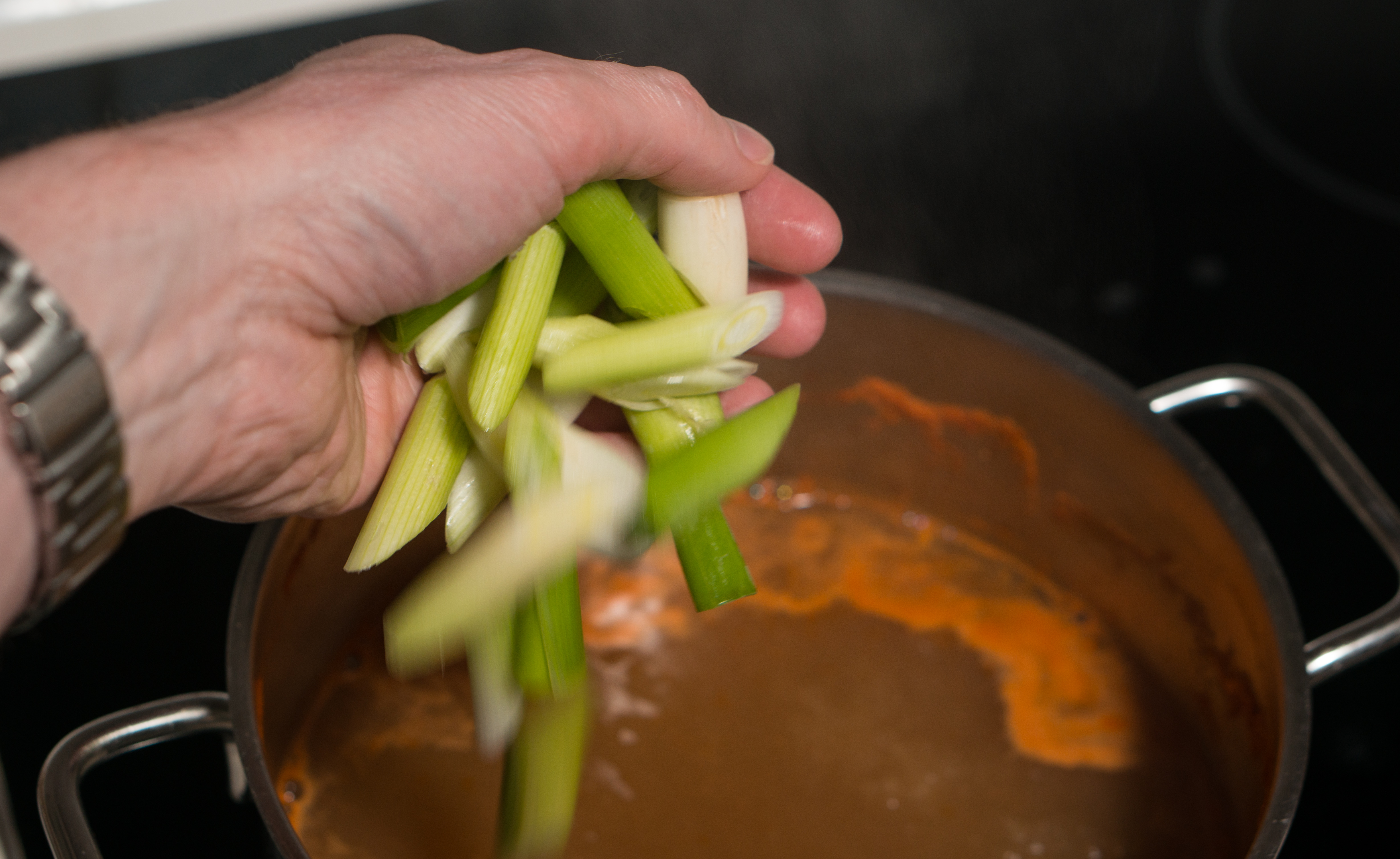 Cut the white part of the scallions into 2.5 cm (1 inch) lengths on the diagonal. Bring the stock to a boil and add the white part of the scallions.