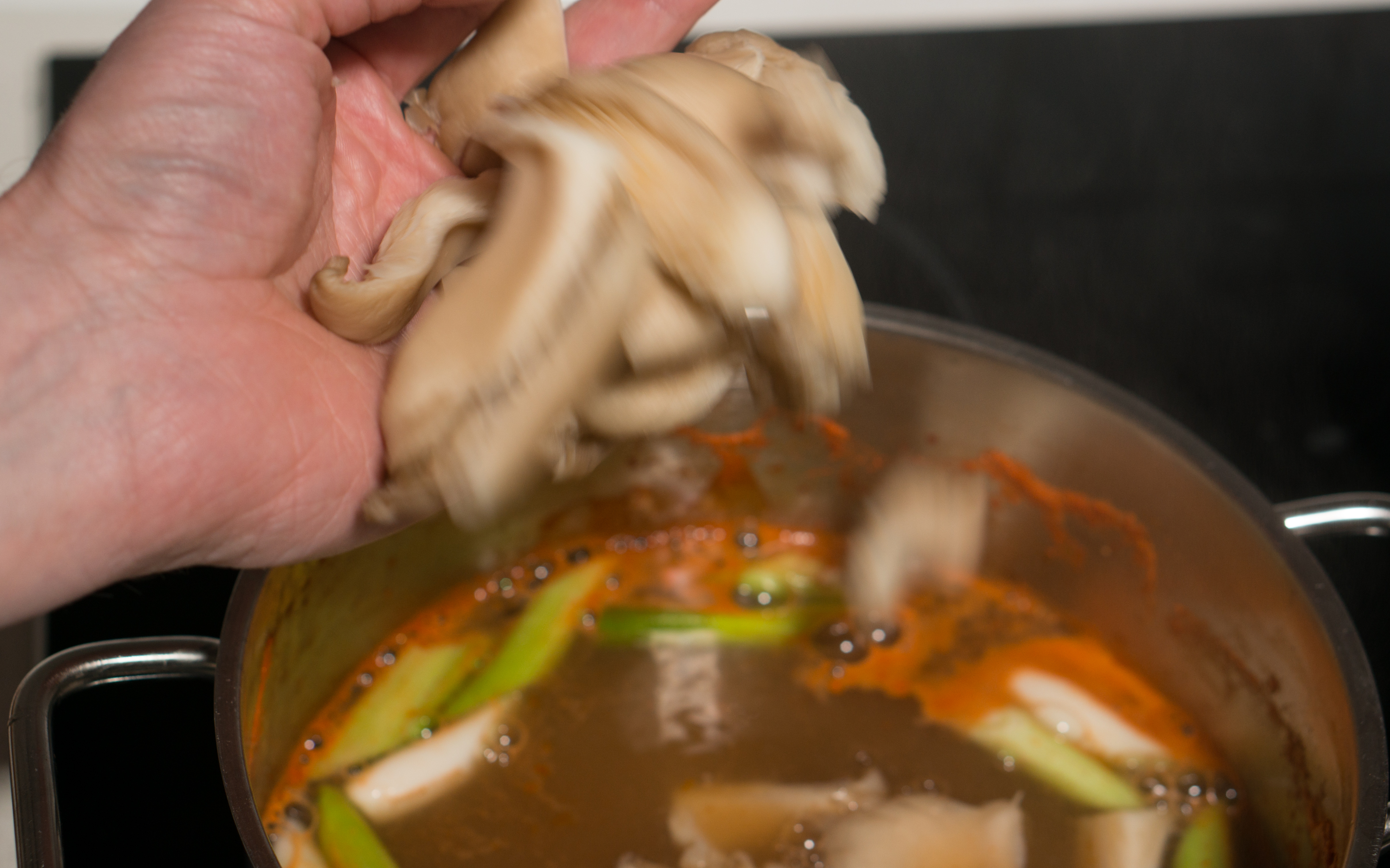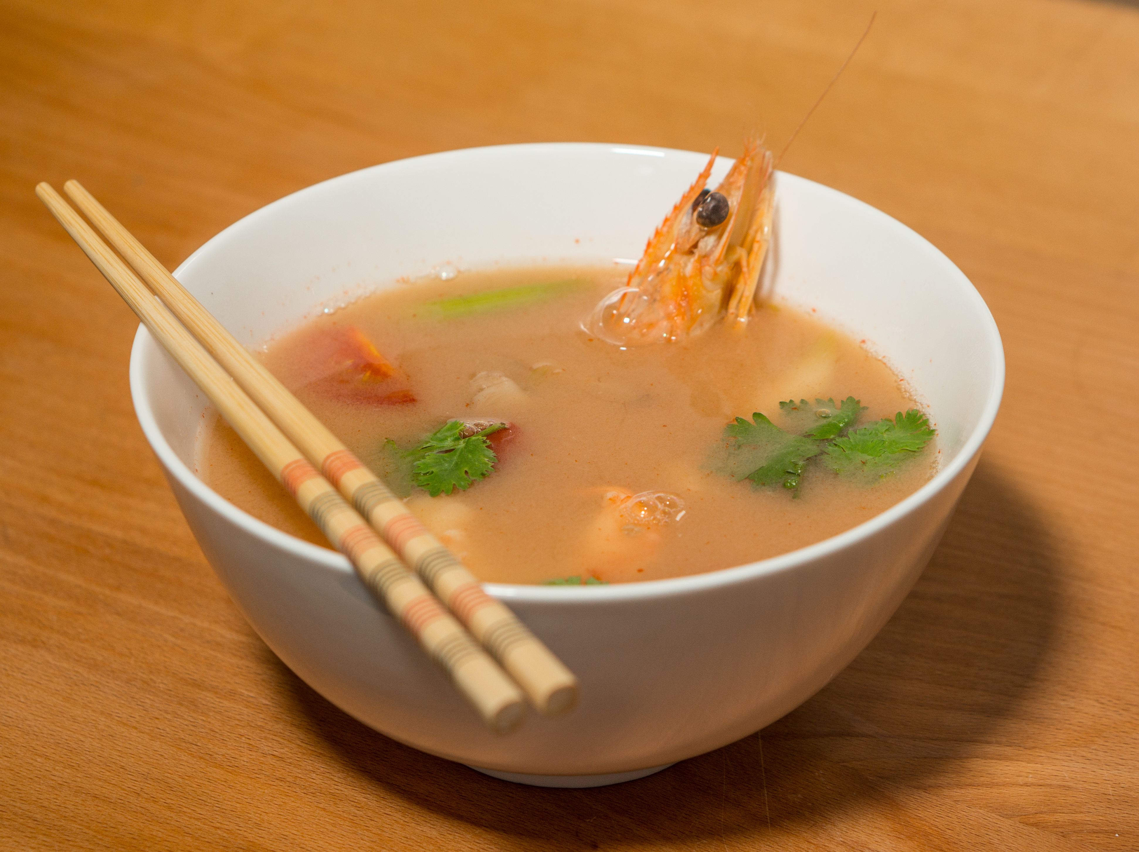 My friend Melvin is great at cooking Asian dishes, and recently he made tom yum goong for us. This is a sour (from lime) and spicy (from chillis) Thai soup with shrimp. We liked it a lot, so I wanted to try making it, too. You can decide on how spicy you’d like it by adjusting the number of chilli peppers. Using the shrimp heads and shells gives the stock a great shrimp flavor. I opted to serve it with only the pieces you are going to eat, and remove the stock ingredients before serving. Here is my version.