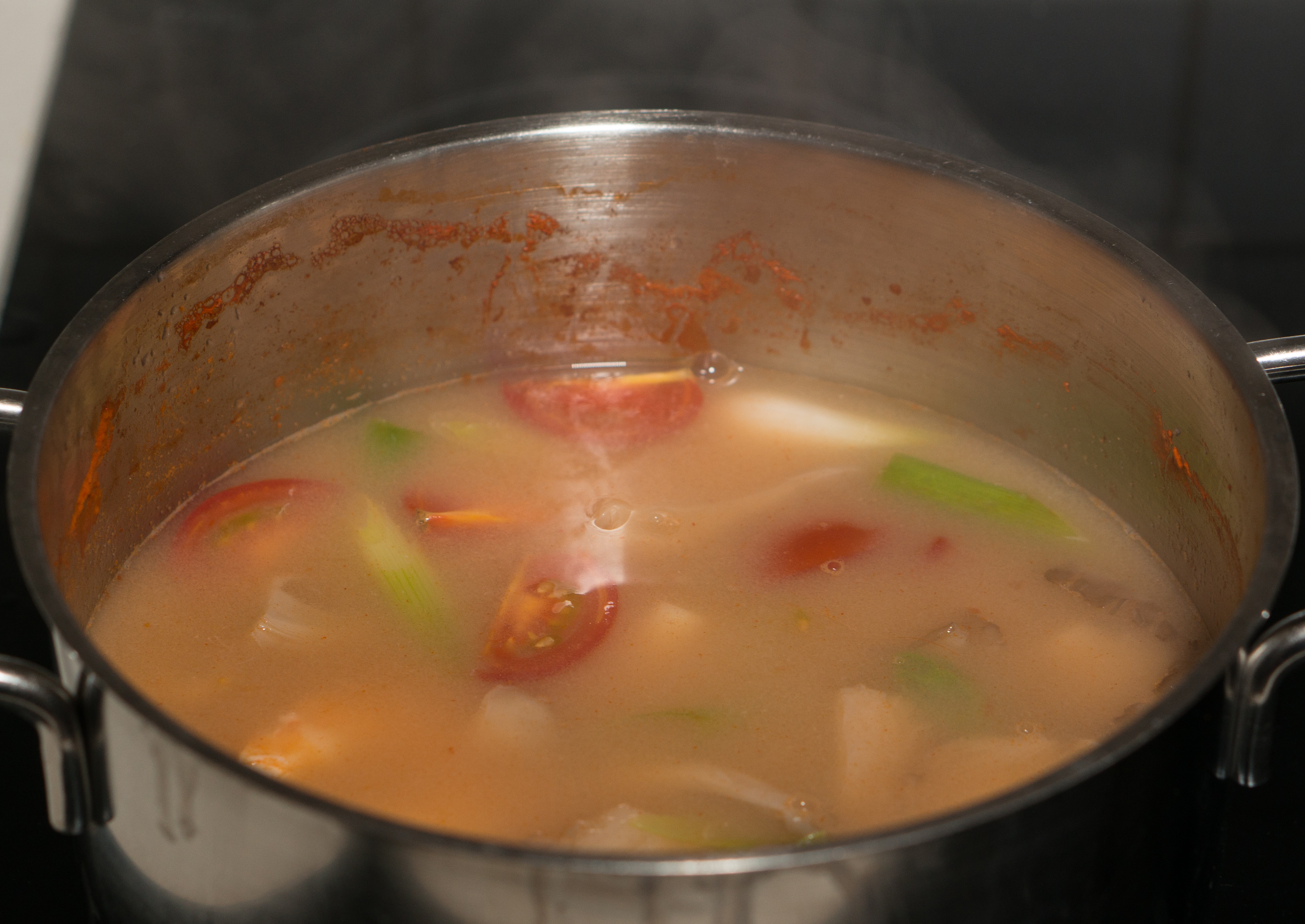 In the meantime, peel and devein the shrimp and add the shrimp heads and shells to the stock.