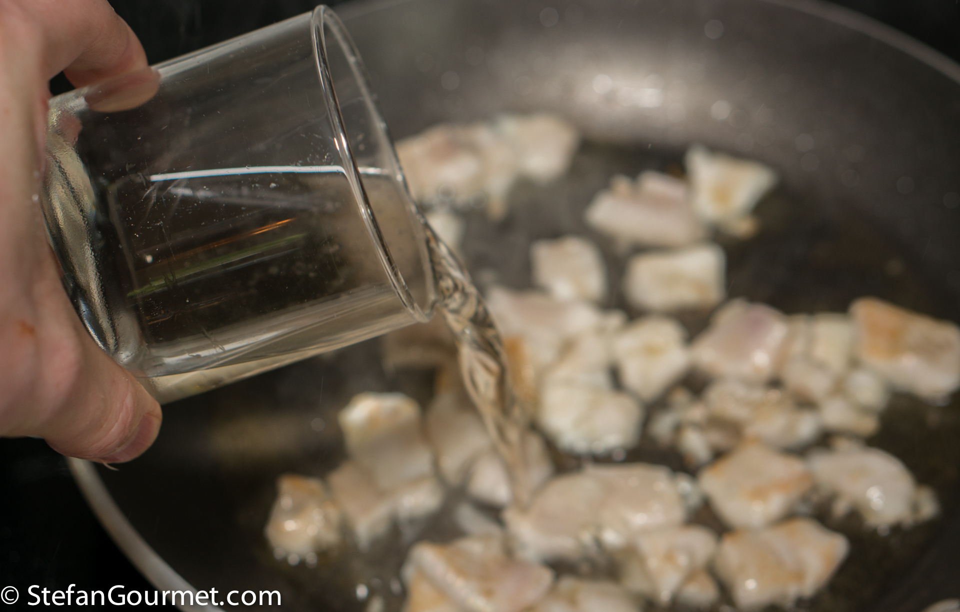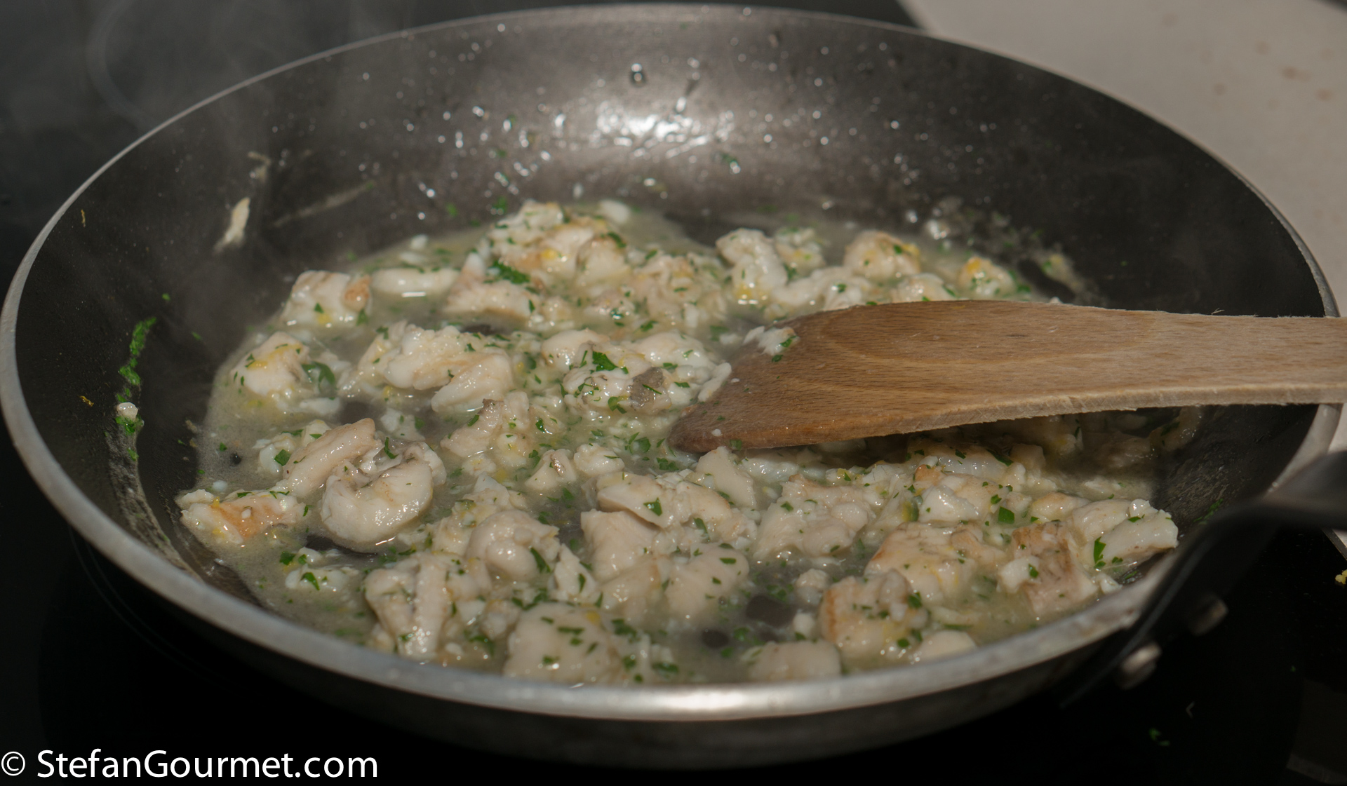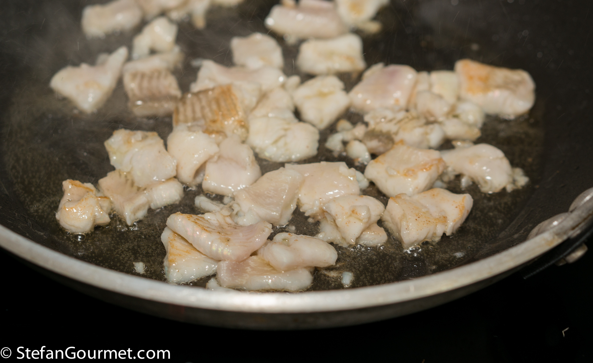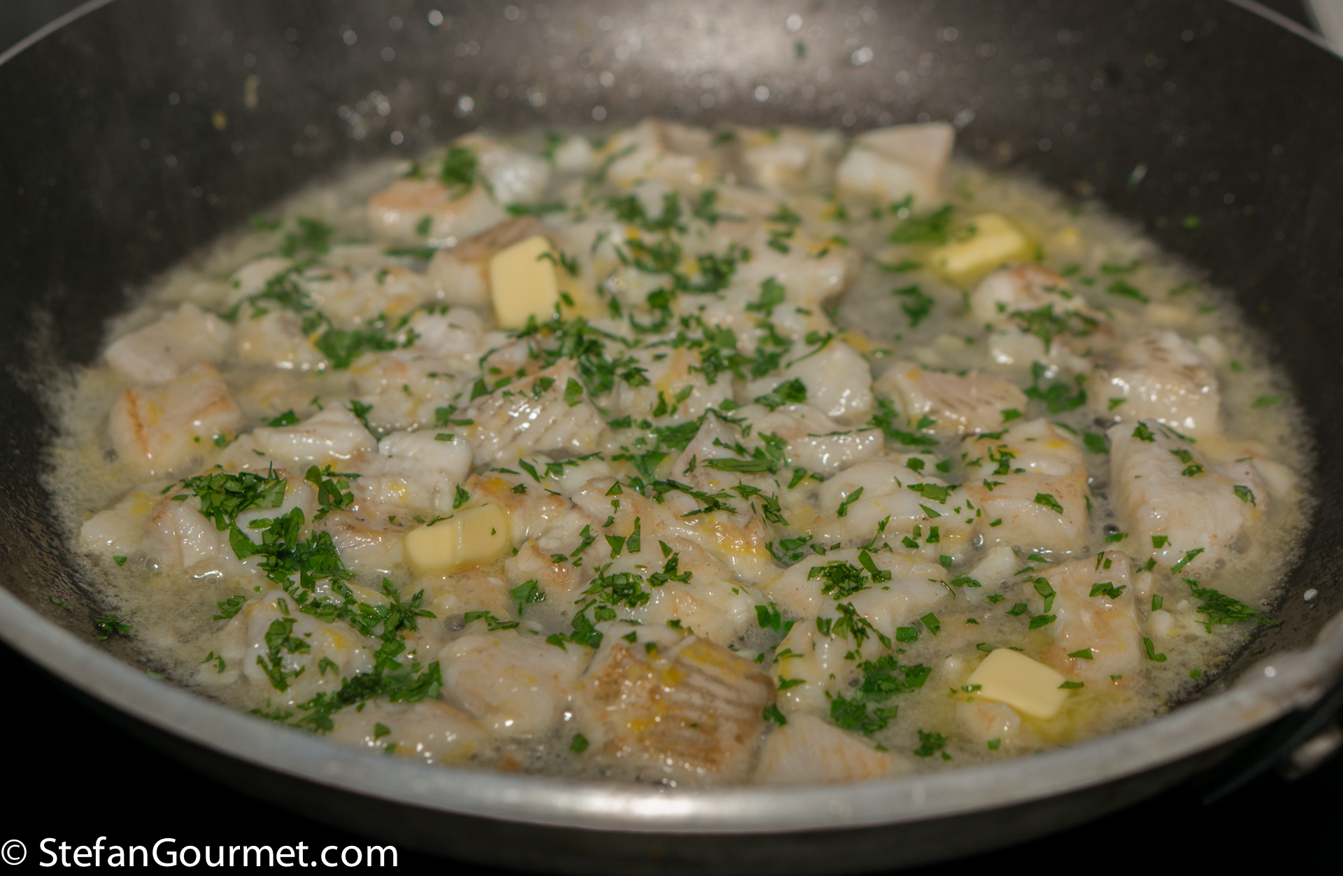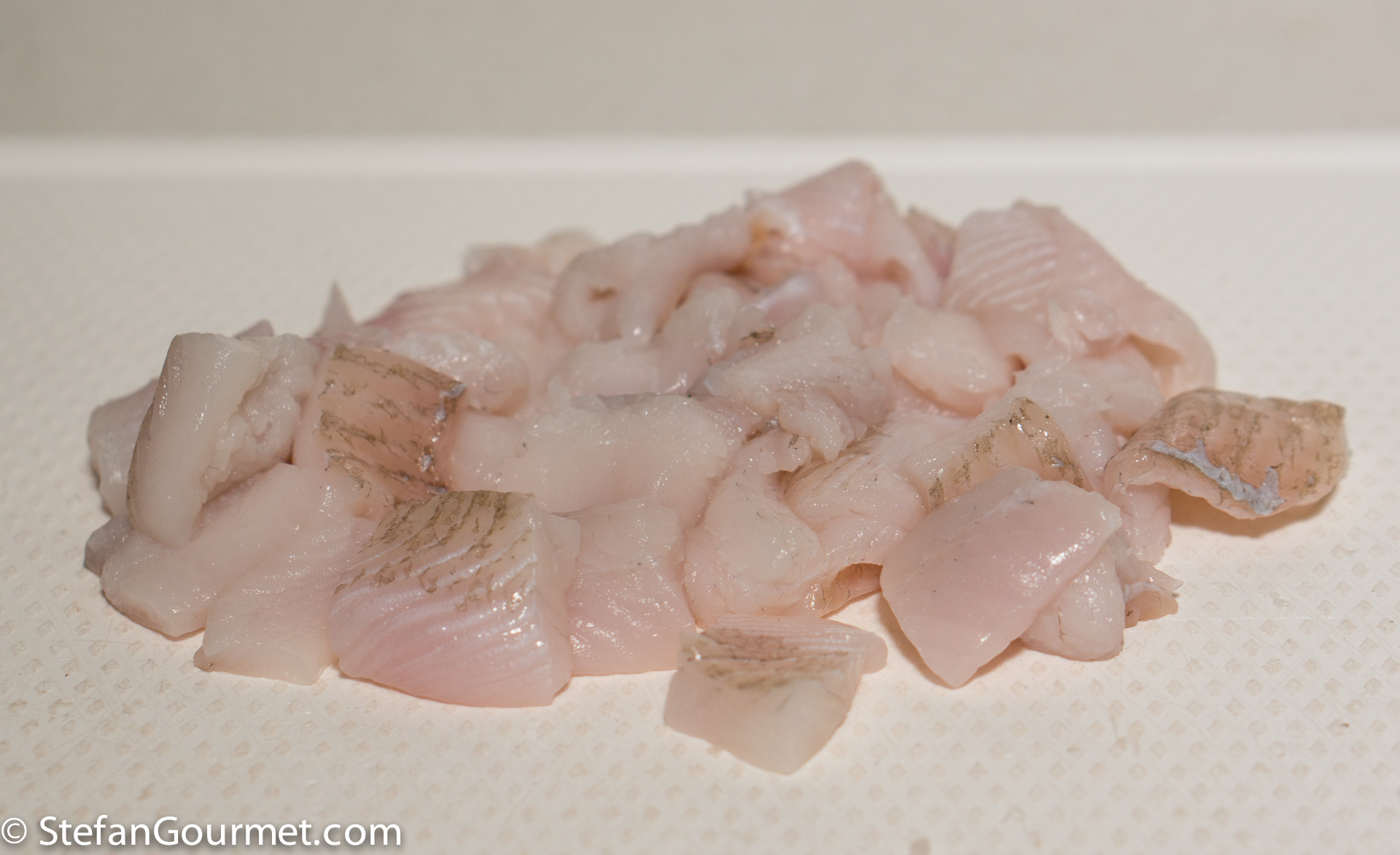 Bring a large pot of water to a boil. In the meantime, cut the fish into pieces of about 1.5 cm (1/2 inch) and season with salt and a small amount of freshly ground white pepper. Mince the parsley and make sure you have all the other ingredients ready.