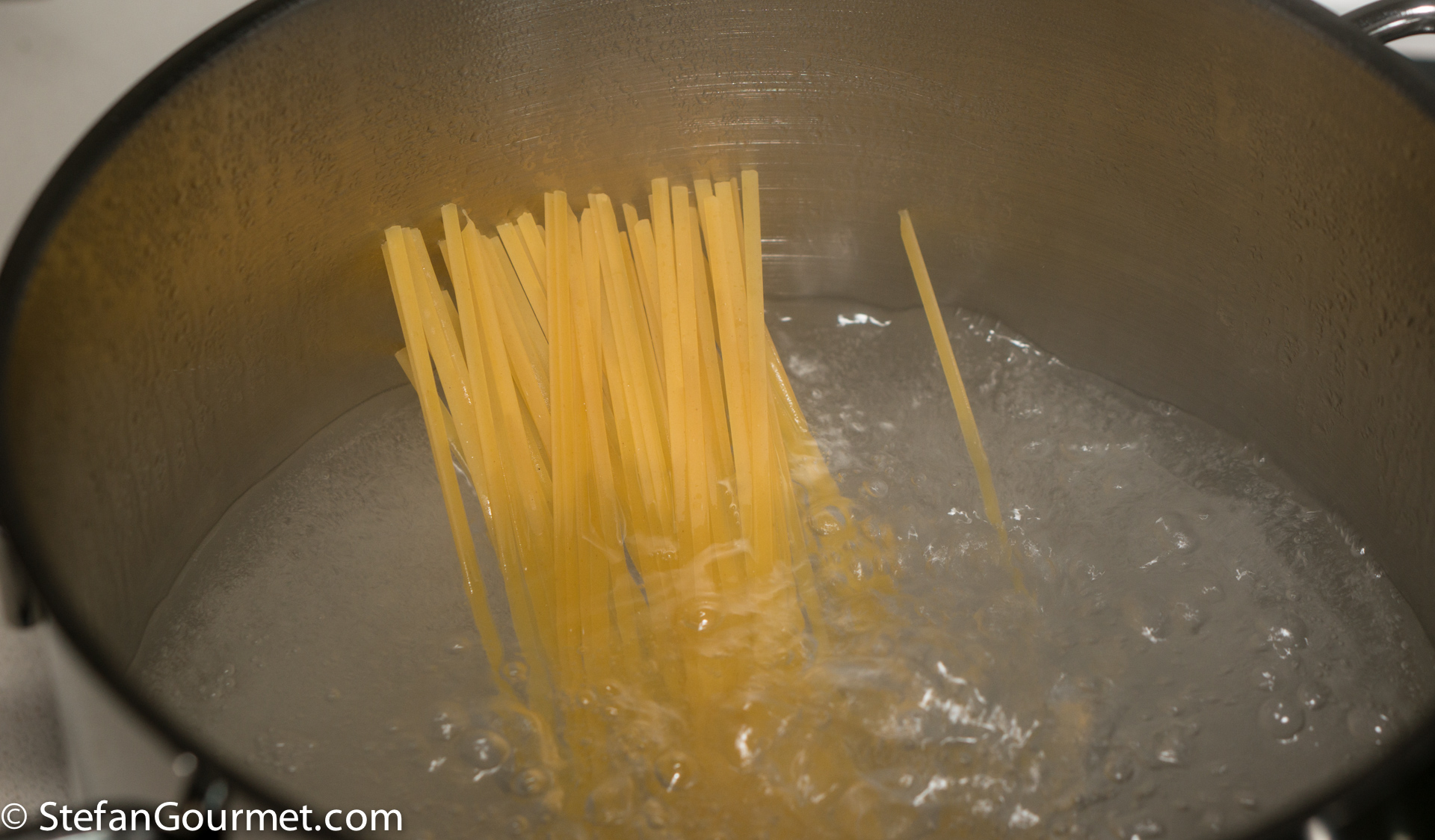 When the water boils, add salt and the linguine. Cook the linguine for the time indicated on the package for al dente.