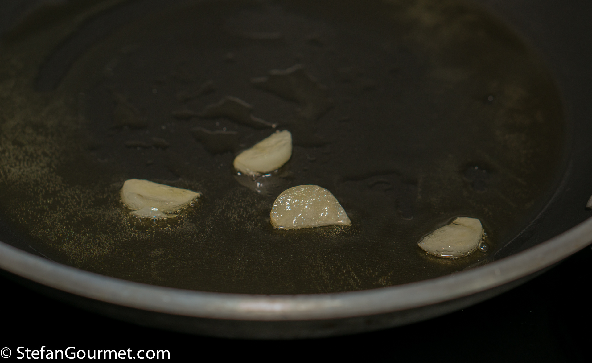 Meanwhile, heat 2 Tbsp of extra virgin olive oil in a non-stick frying pan over medium heat. Add a sliced clove of garlic, and cook until the garlic starts to color on both sides, then discard the garlic. Do not allow the garlic to brown, because that would ruin the flavor.