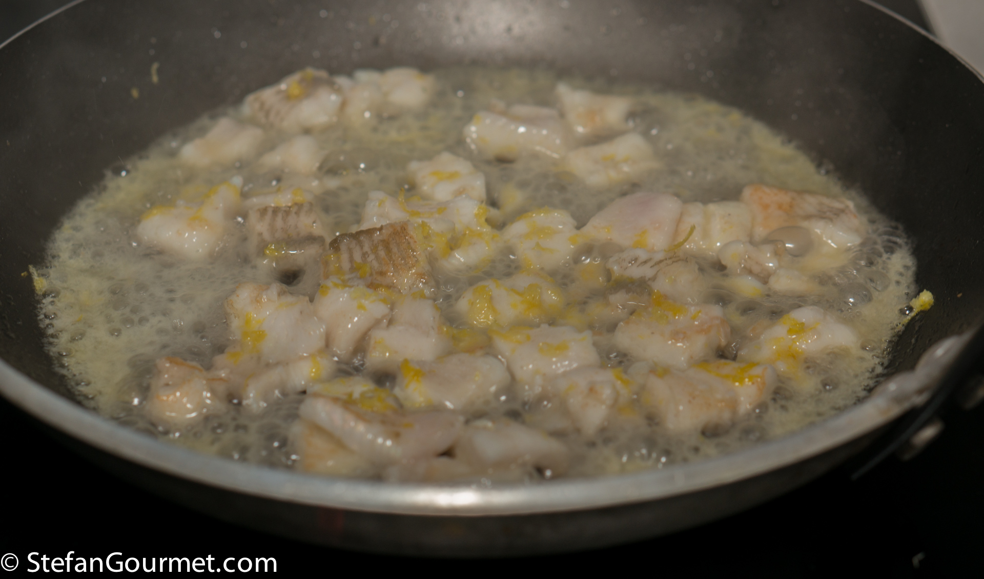 …and about two teaspoons of lemon zest. Cook over medium high heat until the juices start to thicken, not longer than a minute or so. The fish will overcook very quickly!