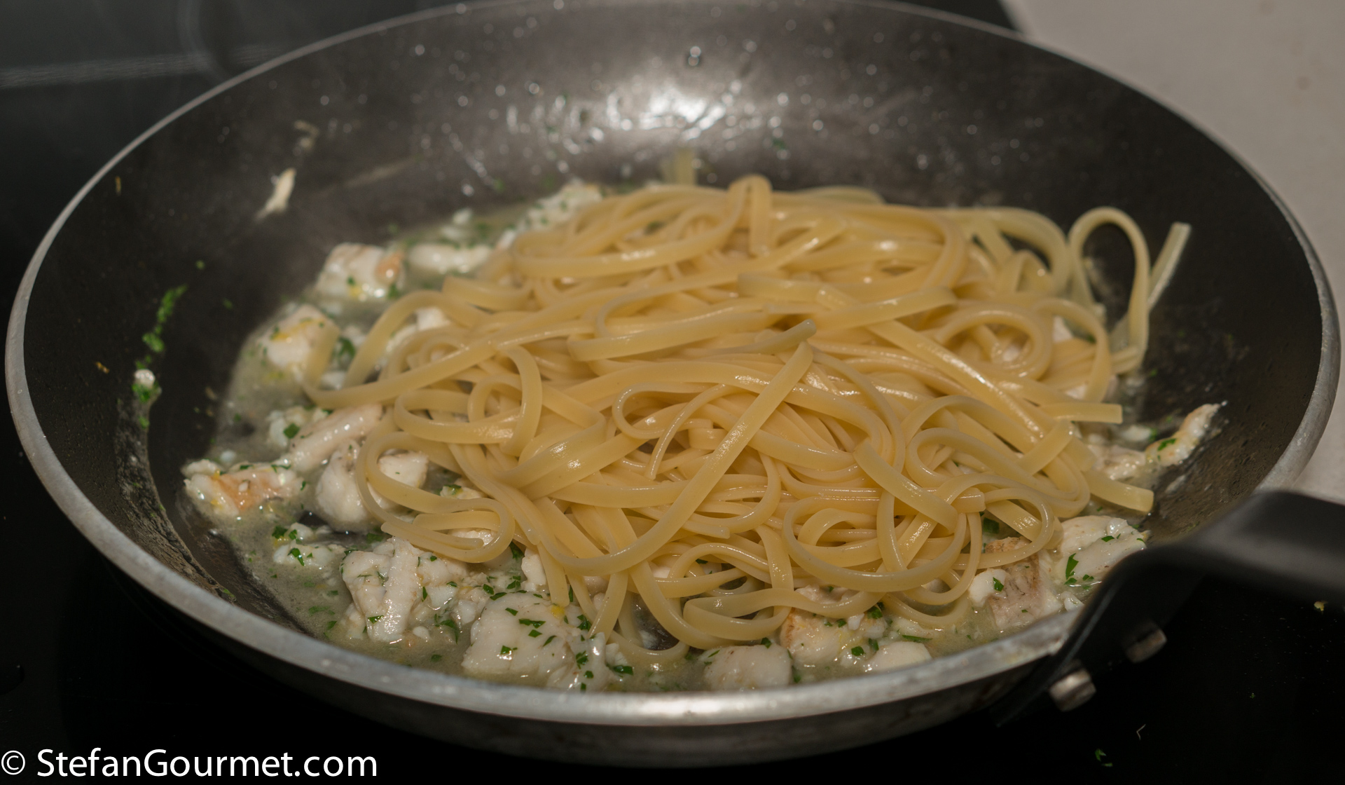 When the pasta is cooked, drain it and add it to the pan with the fish.