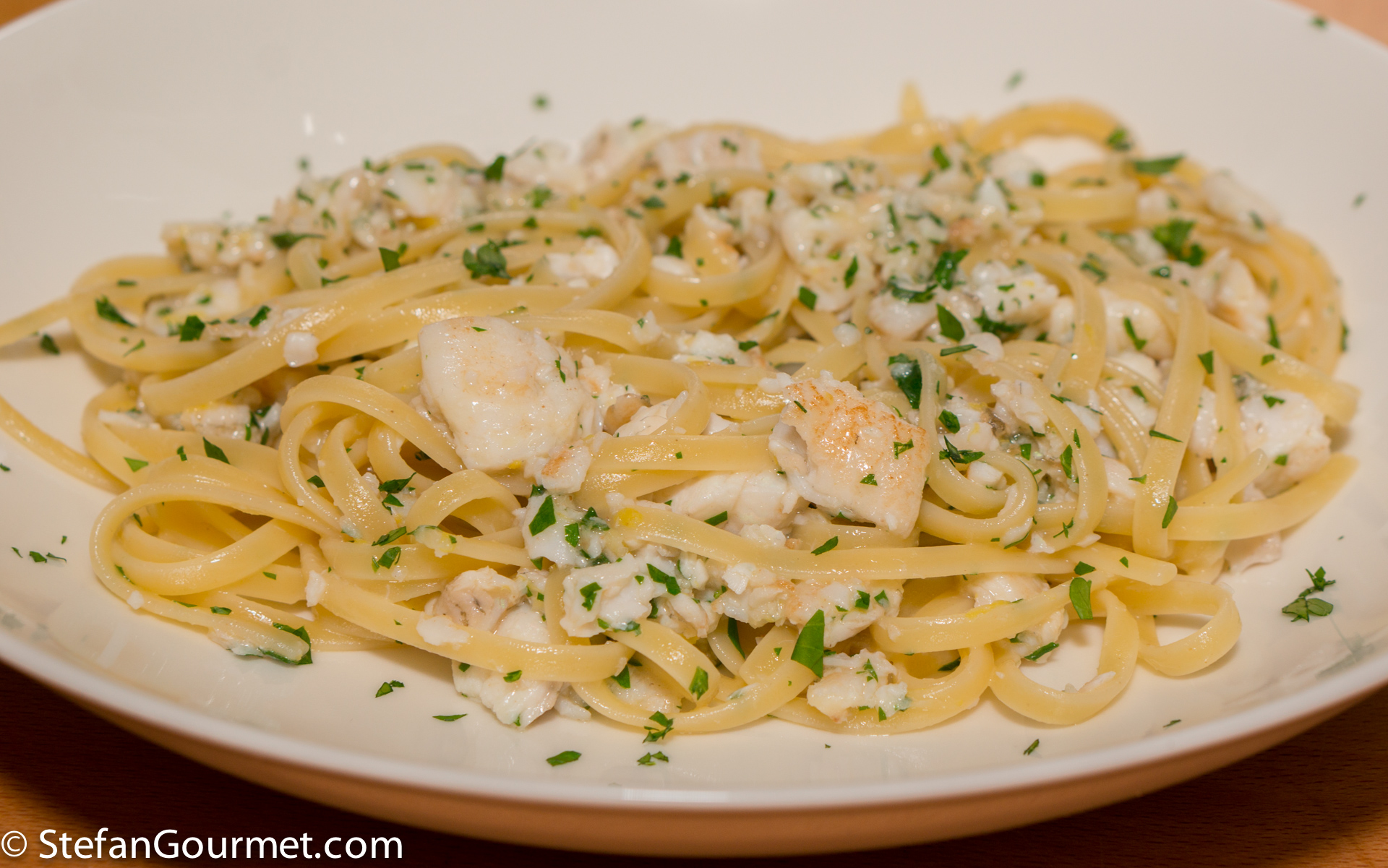This elegant pasta dish can be prepared in the time it takes to cook the pasta. Succulent pieces of sole fillet (I actually used plaice, schol in Dutch) are tossed with linguine pasta in a simple sauce of white wine, lemon zest, parsley, extra virgin olive oil and butter. It is important not to overcook the fish, as that would make it dry and fall apart. This would also be nice with fresh tagliolini.