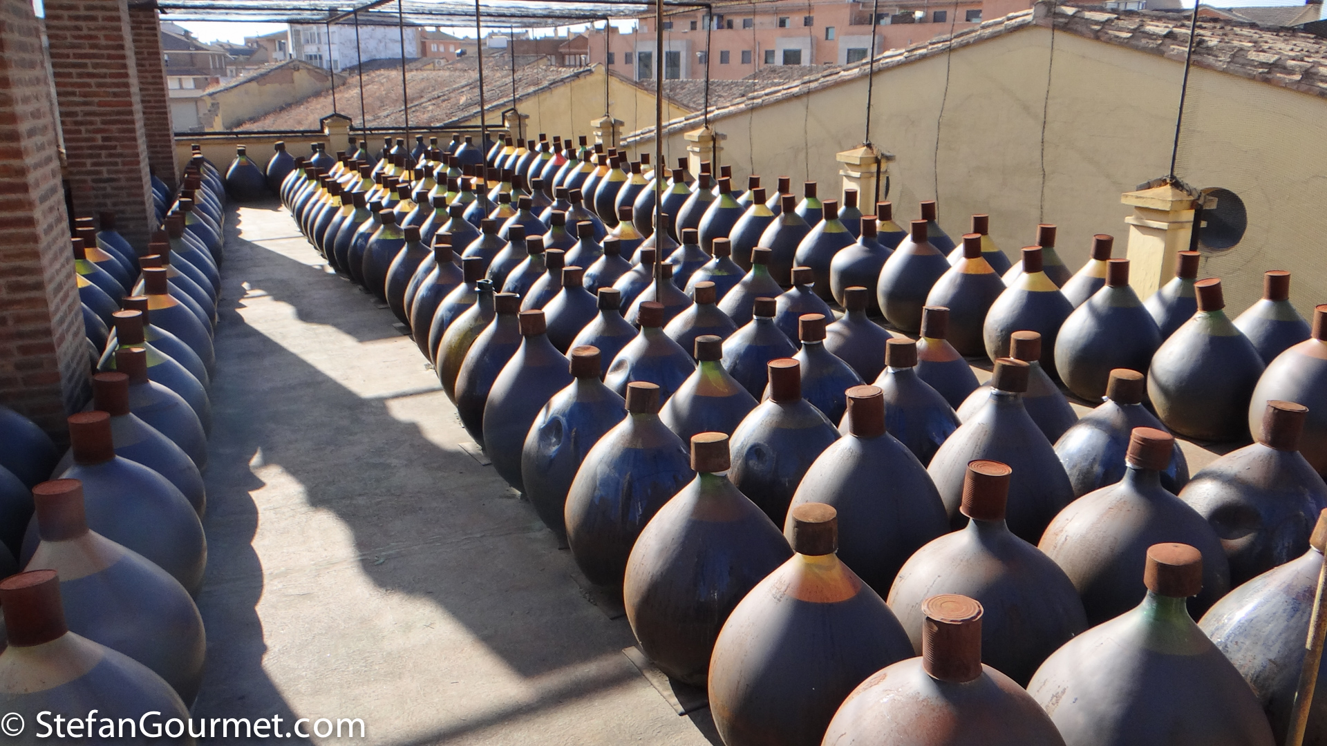 dsc00022Before three years in the large wooden casks, the Capricho de Goya is aged in glass demijohns. These are handmade and are kept on terraces on top of the winery for three more years. They are out in the open so they are exposed to all types of weather including snow and sweltering summer heat. The demijohns aren’t emptied completely, but like in a solera system for sherry some is taken out when new wine is added, so it is a mixture of many vintages. You can see from the level in the demijohns that some of the wine evaporates, accounting for the alcohol by volume ending up at 15.5% even though the wine was fortified only to 15%.