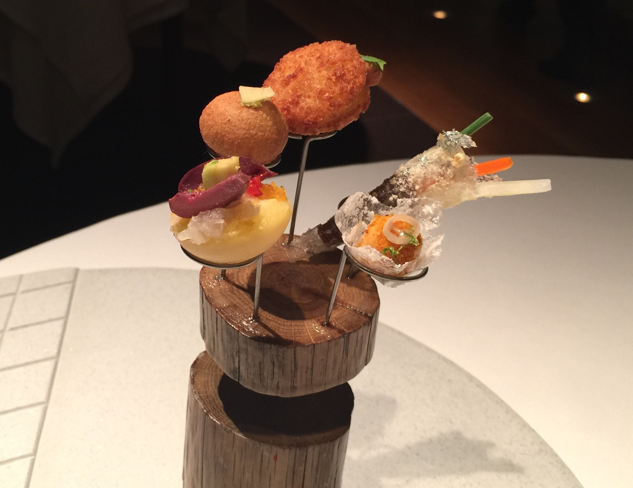 Before the menu begins, there is an amazing series of small appetizers. It starts with a ‘journey around the world’: Thailand (chicken with coriander, coconut, curry, and lime), Japan (miso cream with nyinyonyaki), China (pickled vegetables with plum cream), Peru (causa limeña), and Korea (panko fried bread, bacon with soy sauce, kimchi and sesame oil).