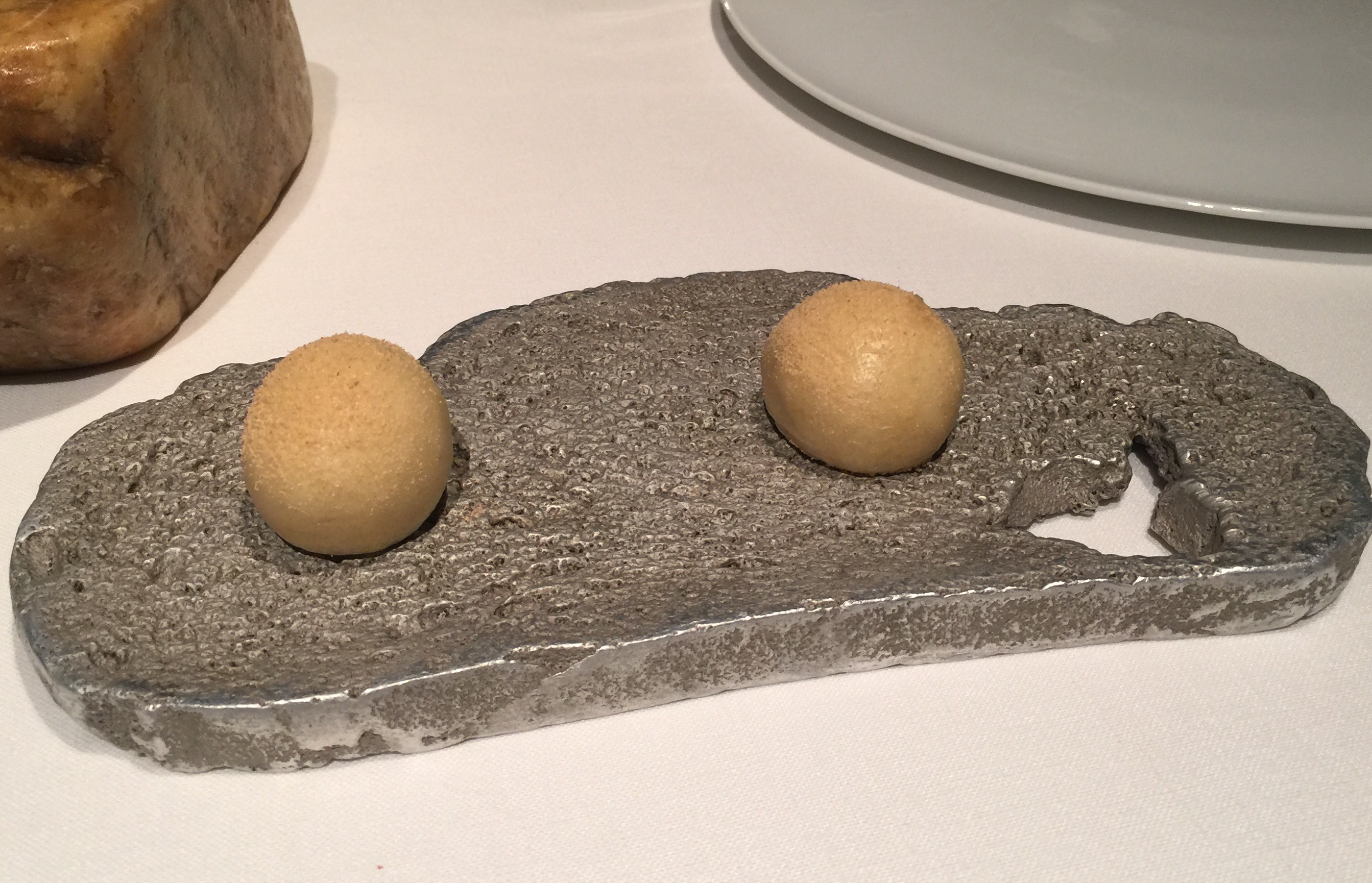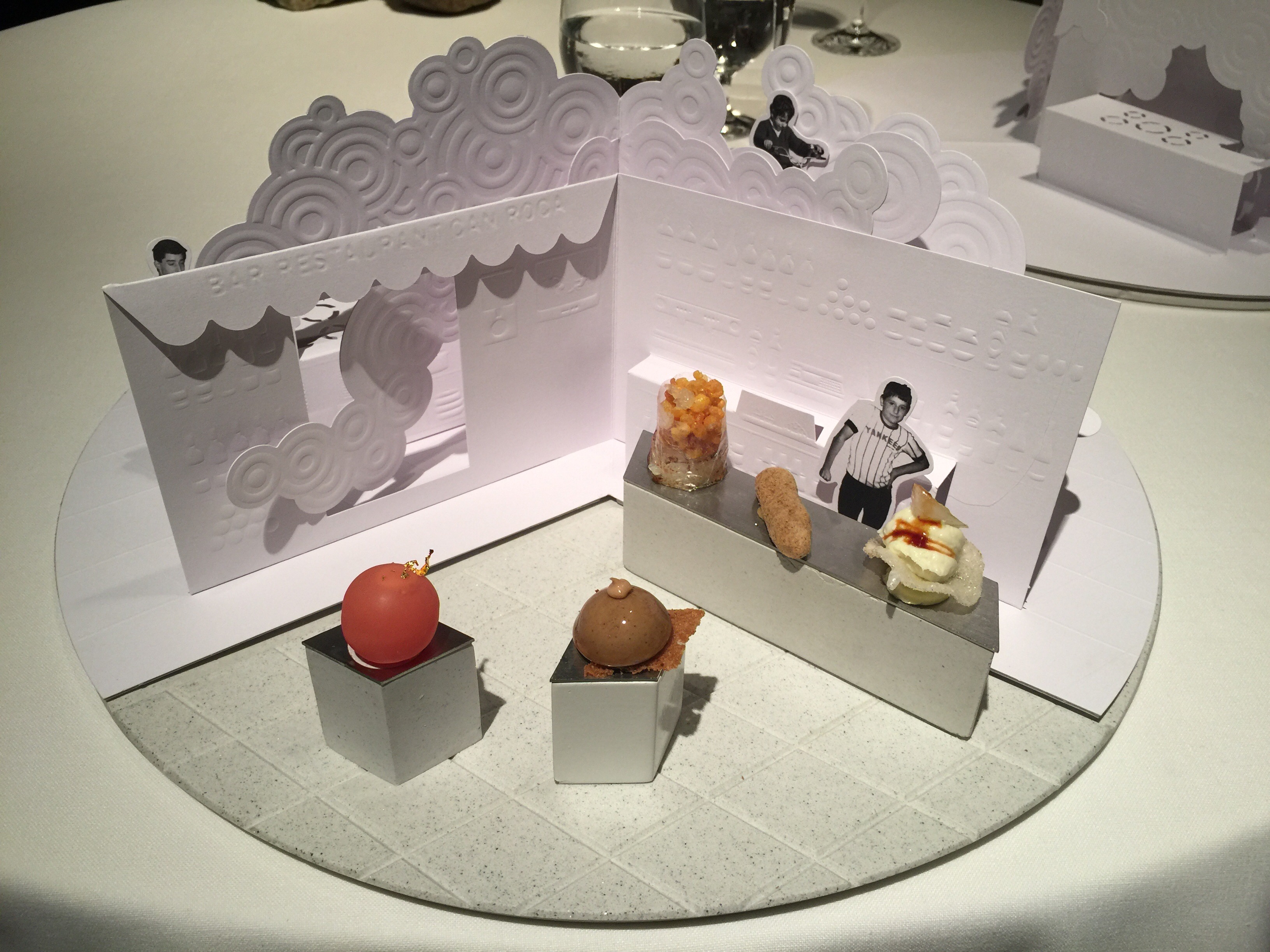 This is followed by memories of their parents’ bar in the suburbs of Girona where they grew up: breaded squid, kidneys with sherry, pigeon bonbon (with foie), salt cod with spinach and pinenuts, and a campari bonbon.