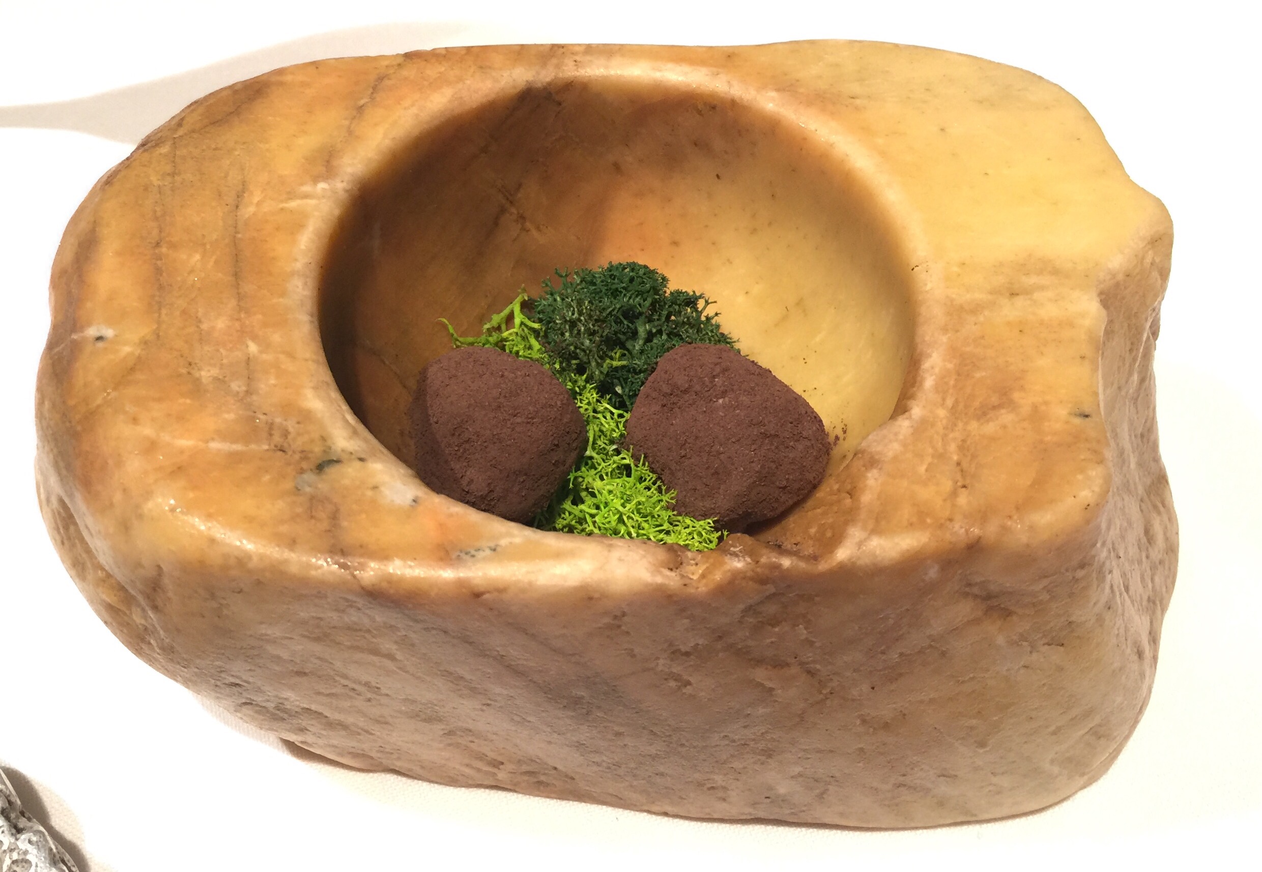 The first dessert, “Rainy forest”: sand distillate water, carob cookie, fir tree dust, aniseed ice cream, wormfood, fennel, paired with a 2010 Mosel Riesling Kabinett. The Riesling only has a tiny amount of residual sugar, but worked very well with this fresh dessert. It was almost like eating dirt, but in a good way. 9/10