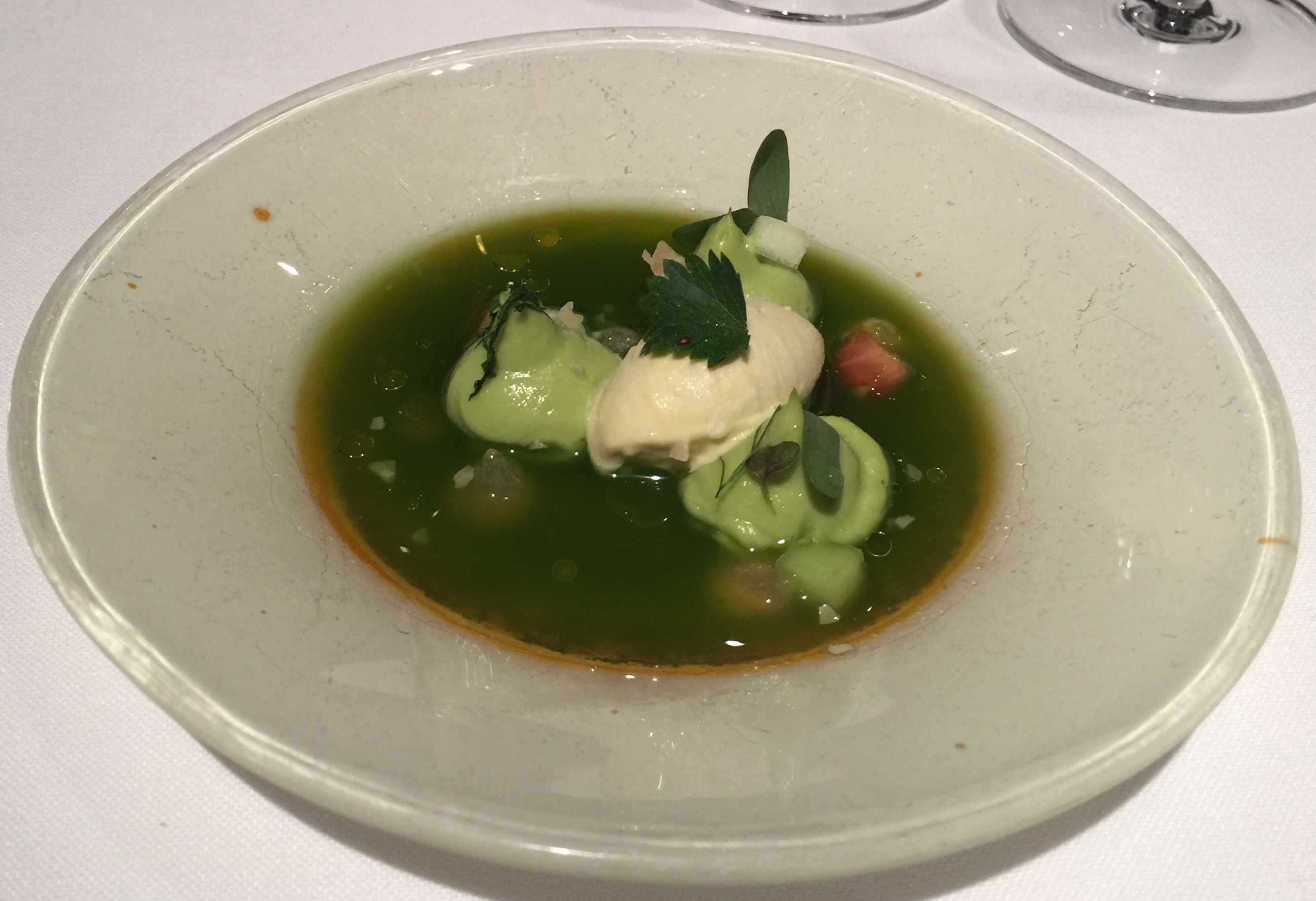 Three different dry sherries are served with the first course of the tasting menu: a manzanilla, a ‘summer’ manzanilla, and an amontillado. Now I am not a fan of manzanilla, so I was wondering what they’d serve with this.