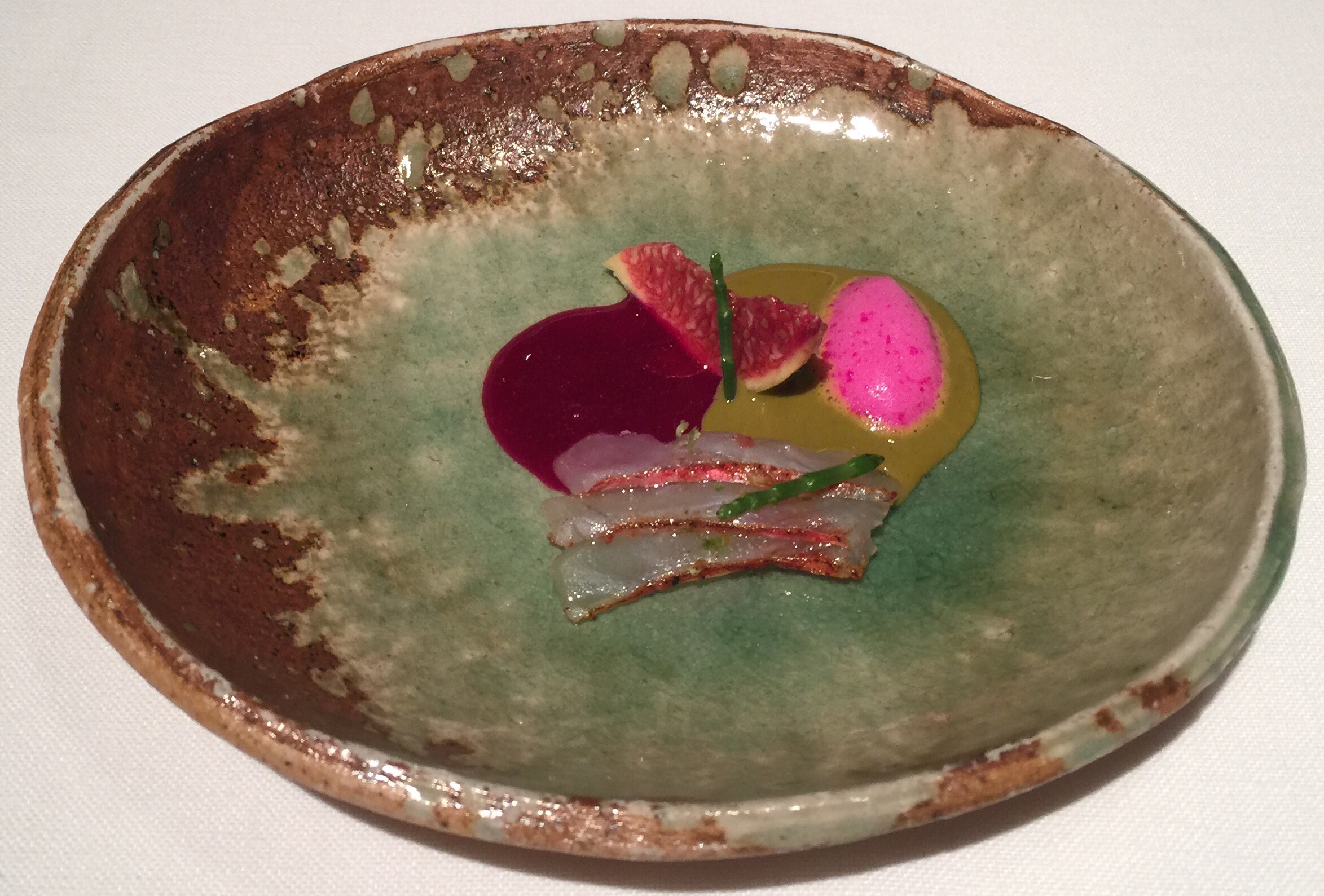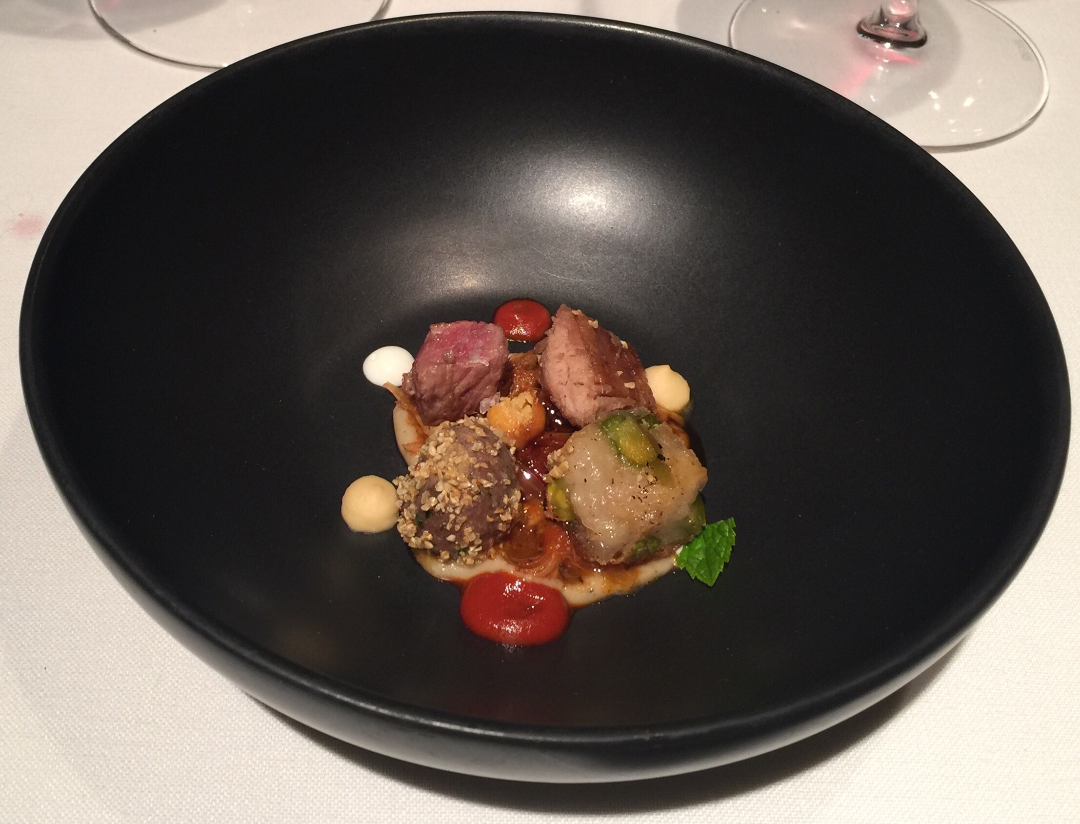 Red mullet with kombu, prickly pea foam, sea anemone, salicornia, and katsuobushi vinegar, paired with a 2014 Sancerre. The red mullet with kombu was divine and worked well with the Sancerre. The Sancerre became even more acidic than it already was from the fruity prickly pear, so the only wine pairing of the evening that was questionable. Still a nice dish, 8/10.