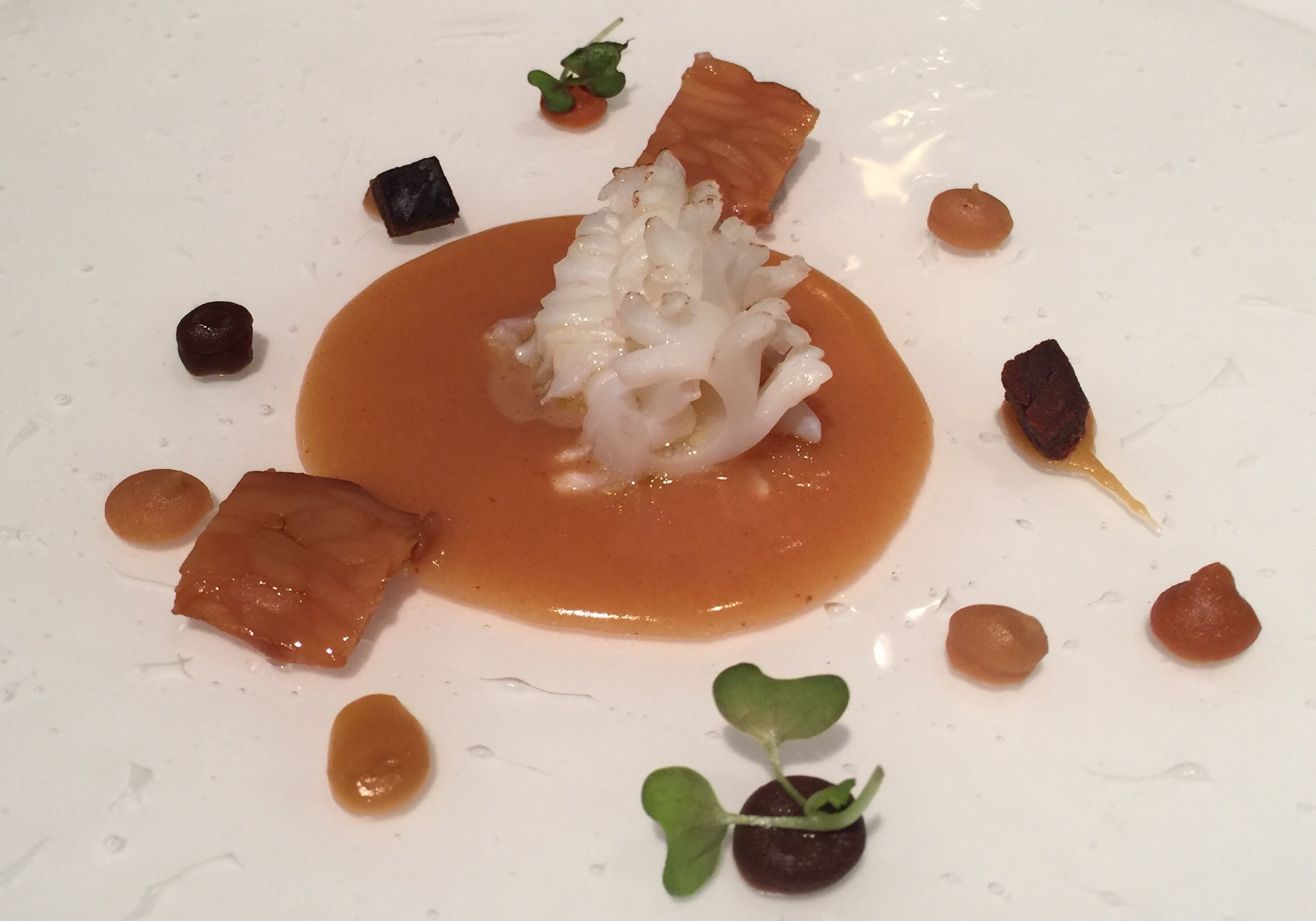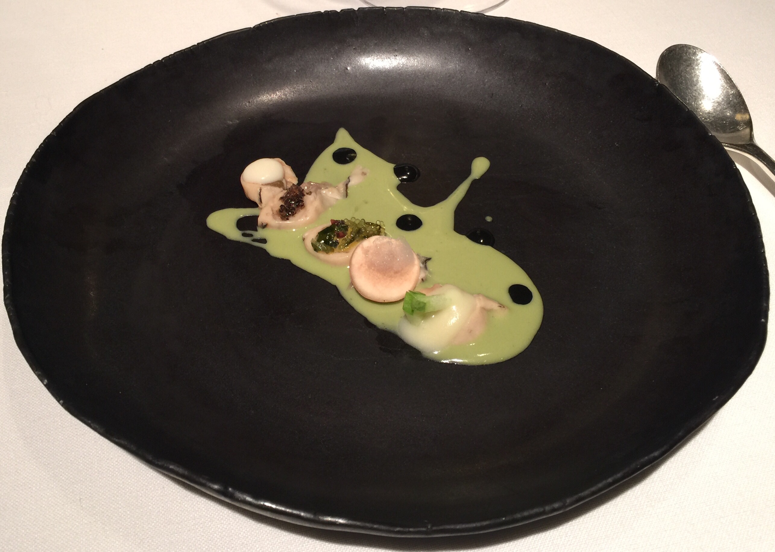 Oyster served four ways: apple, seaweed, truffle, distilled earth and sea anemone, plus a fennel sauce with black garlic. Paired well with a Chablis Grand Cru 2009. The oyster was delicious, slightly warmed with a good texture, and worked very well with all four flavors. 9/10