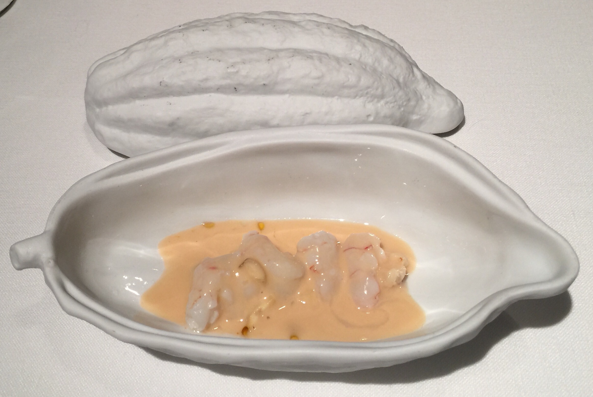 The langoustine with cocoa bean sauce was one of the best dish of the evening, paired very well with a slightly oaked Puligny-Montrachet. The presentation in a porcelain cocoa bean, the texture and flavor of the barely cooked langoustine, the creative combination with cocoa been, mantis shrimp cream, and coconut and white truffle, everything was perfect about this dish. 10/10
