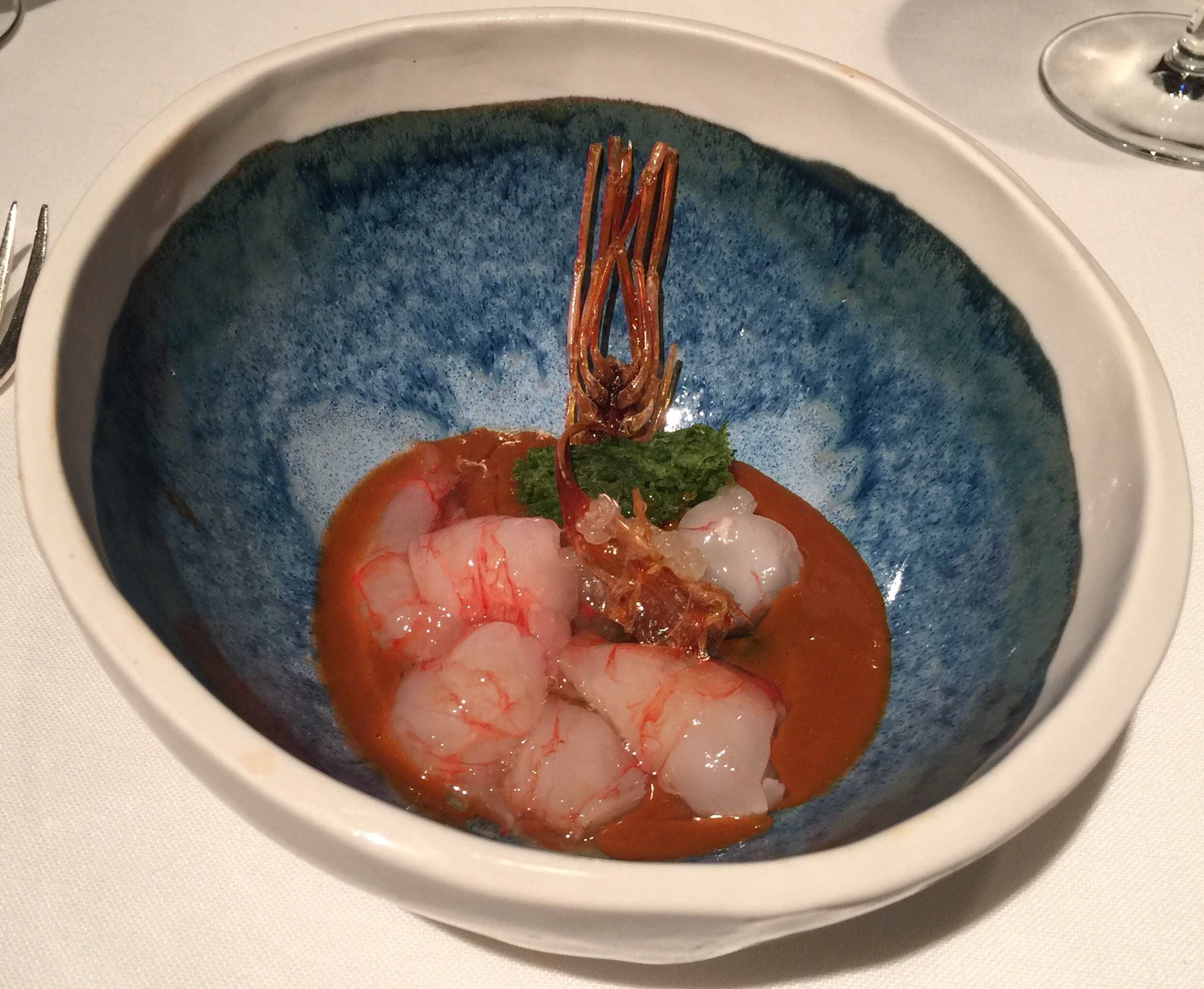 Prawn marinated with rice vinegar, and served with prawn head juice and crispy prawn legs. The prawn is very fresh and hardly cooked with a velvety texture, nicely contrasted with the crunchy legs. A new take on a signature dish and just as good. The pairing with a creamy Mosel riesling (Spätlese Trocken) was the best of the evening. 10/10