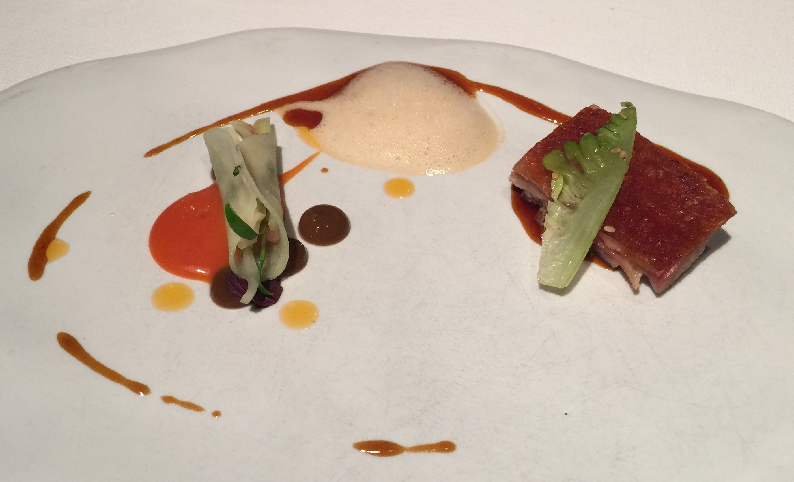 Iberian suckling pig with salad of green papaya, thai grapefruit, apple, coriander, chilli pepper, lime, and cashew. Paired very nicely with a 2012 Nuits Saint Georges (red Burgundy). The suckling pig is very tender, a nice contrast with the very crunchy skin. Very nice combination with the bright Asian flavors. 10/10