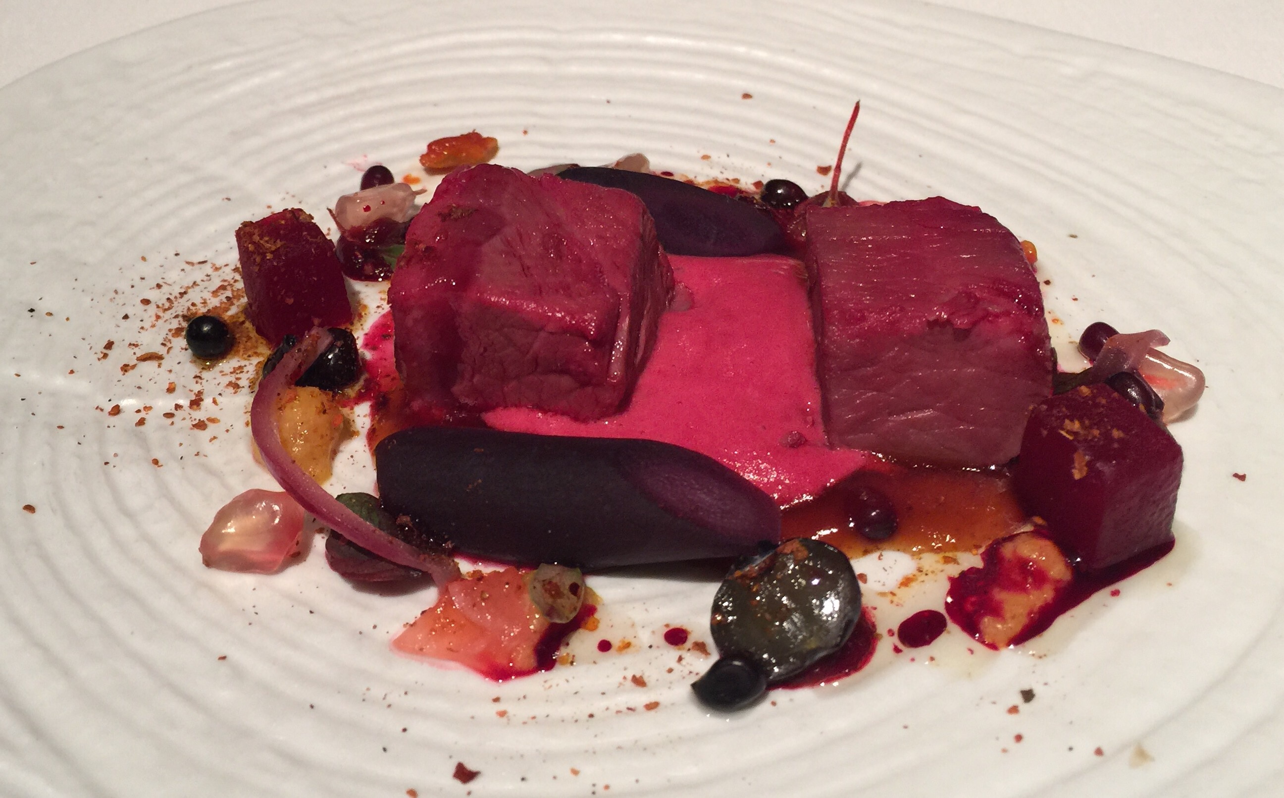 Scarlet veal oyster blade with beetroot bearnaise sauce, cooked for three days (sous-vide) and paired with a 1999 Barbaresco. It is so good to see that some restaurants do manage to serve wines of the proper older vintage. Barbaresco needs time in the bottle, and 1999 is now perfect. It also worked very well with the tender veal and beetroot. 10/10