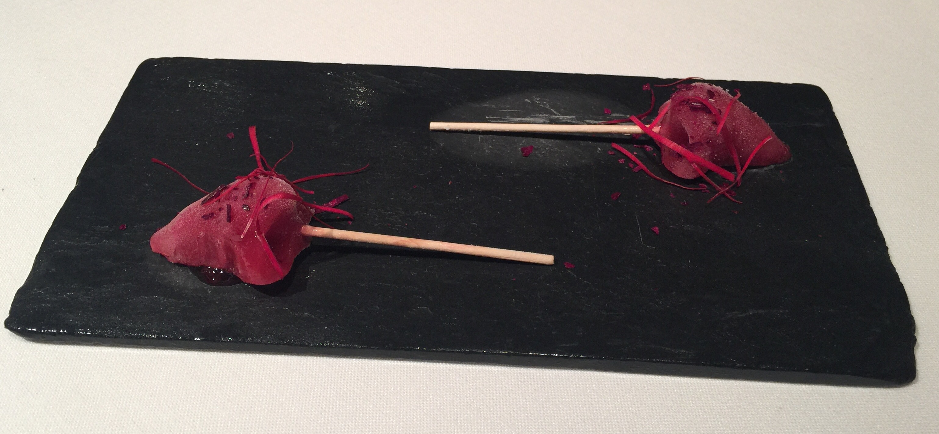 The palate cleaner is a rose popsicle in the shape of the nose of the pastry chef. Very nicely done and an example of the sense of humor of the Roca brothers.