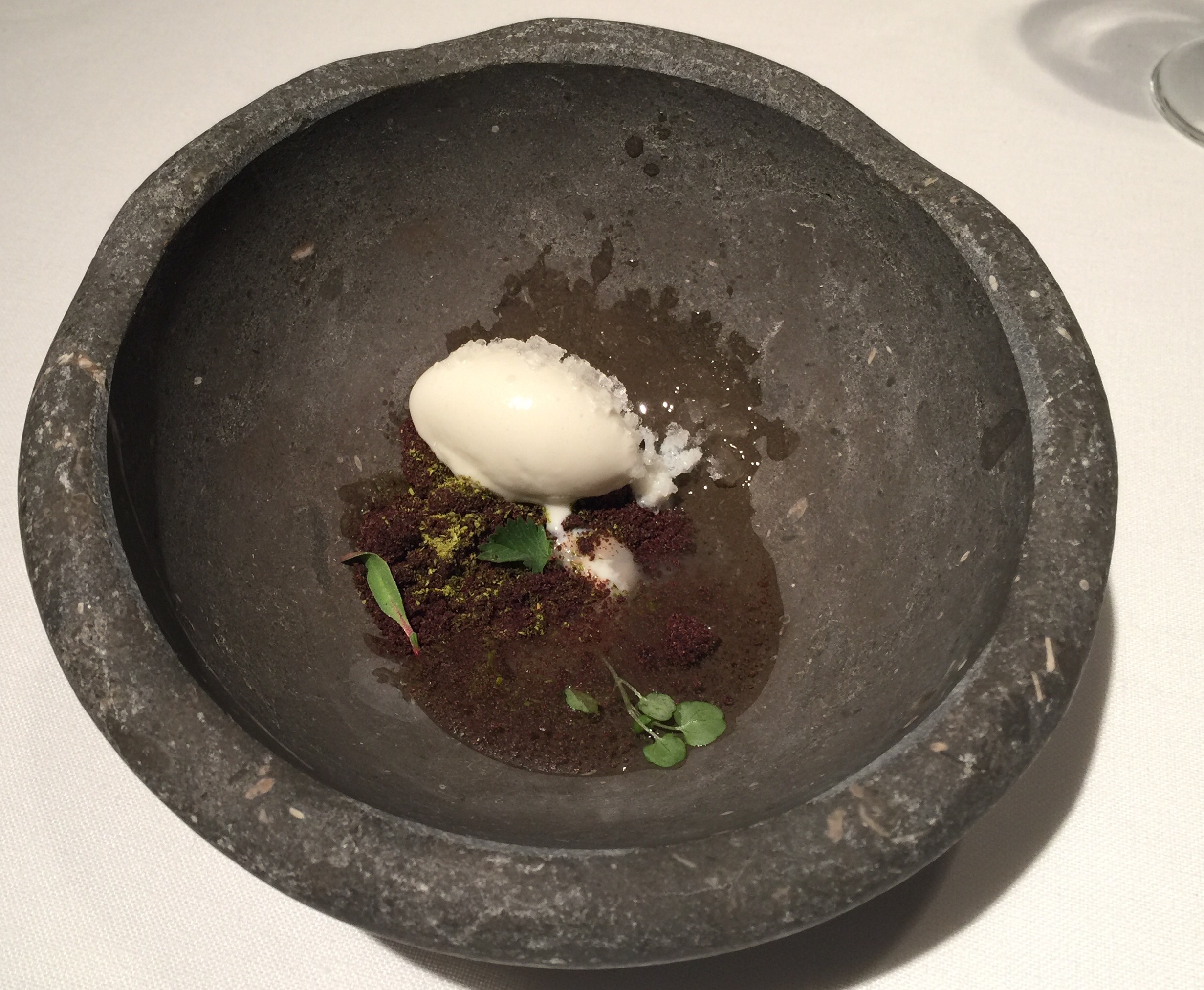 It was a ‘green salad’ of avocado, lime, cucumber, chartreuse, sorrel, green shiso, tarragon, rocket, and oxalis, and last but not least green olive ice cream (similar to that in the bonsai, but with a softer texture). Soft flavors and textures, that did help to make the manzanillas more palatable. I still preferred the amontillado with the dish. 9/10