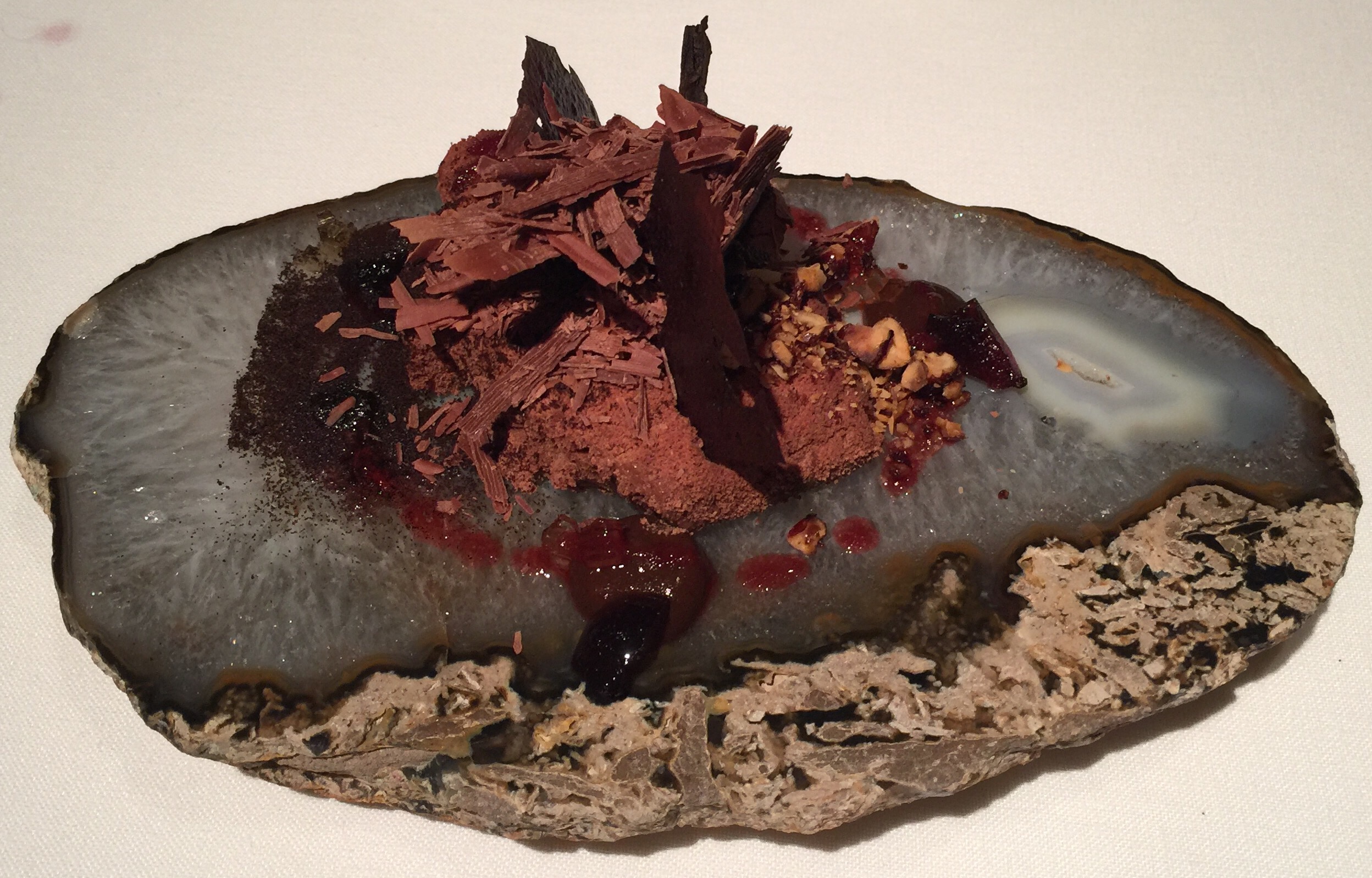 “Cuban cigar box” with chocolate, vanilla, dried plum, tobacco leave, and cocoa, paired with a 20-year old Madeira Malvasia. Very creative and nice textures. 9/10