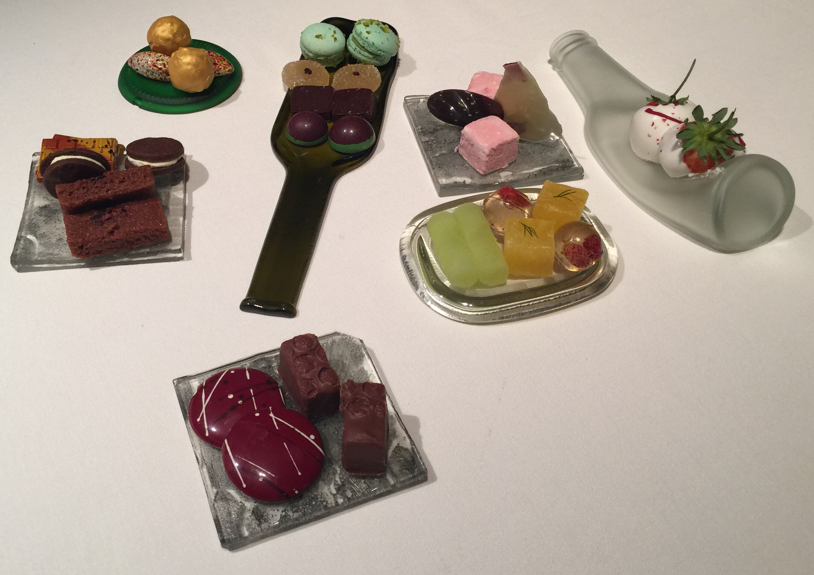 An amazing array of sweets, served on pieces of ‘glass bottles’.