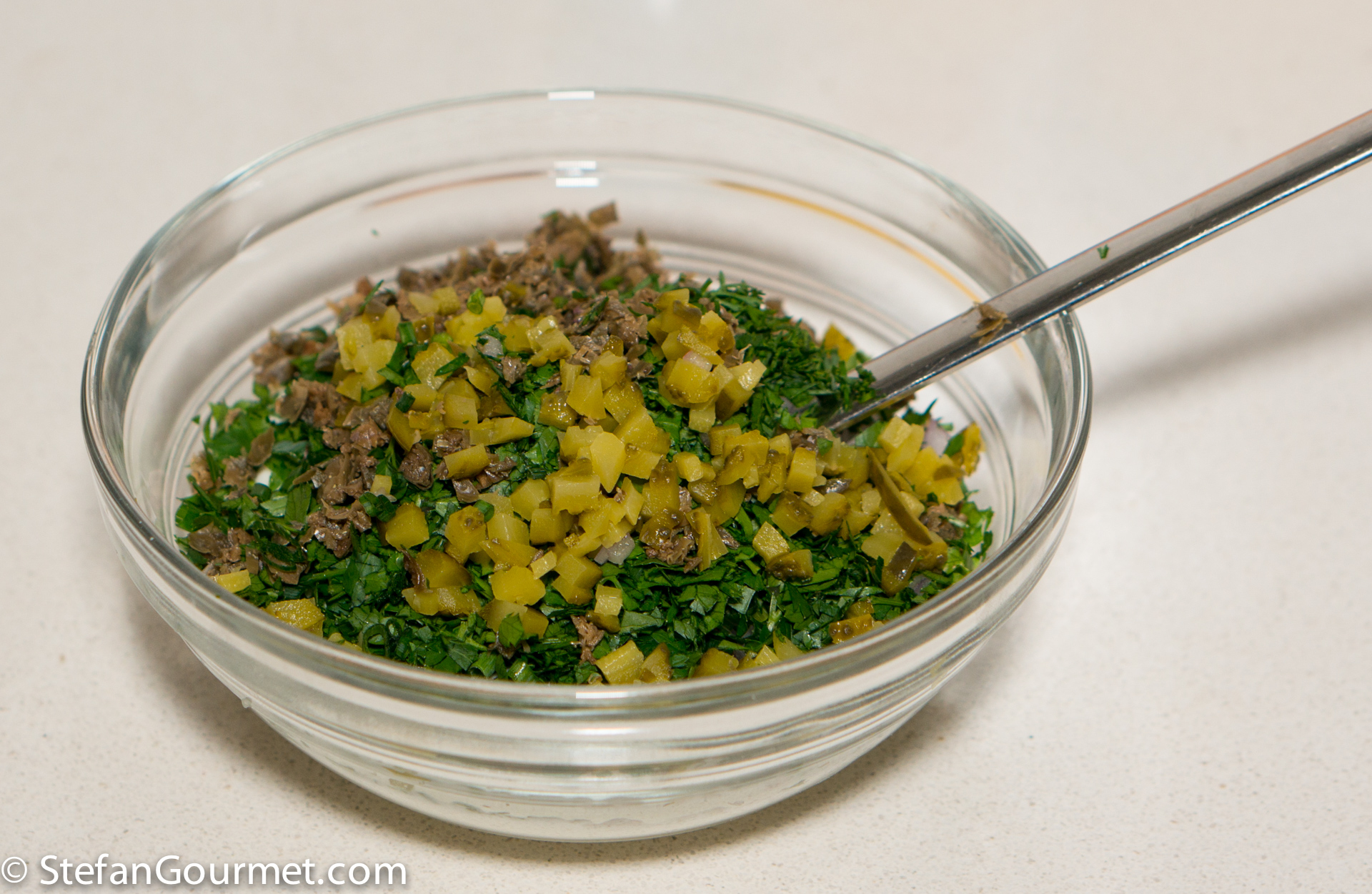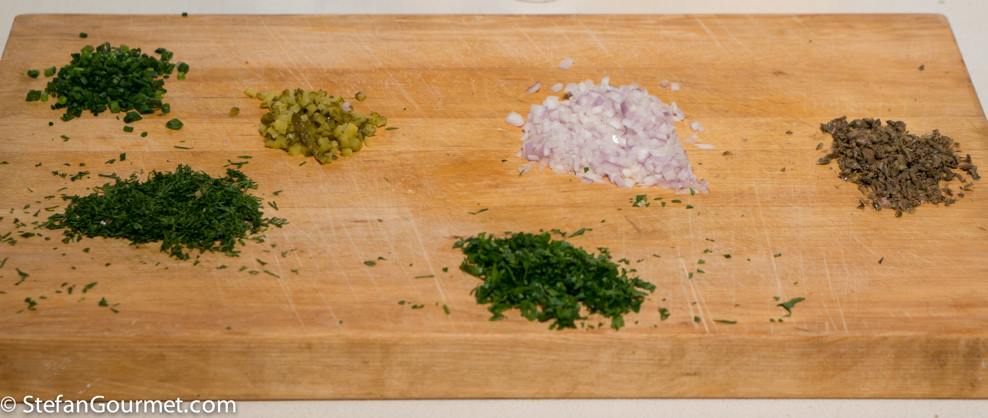 Mince the pickles, capers, parsley, chervil, tarragon, chives, and shallots.