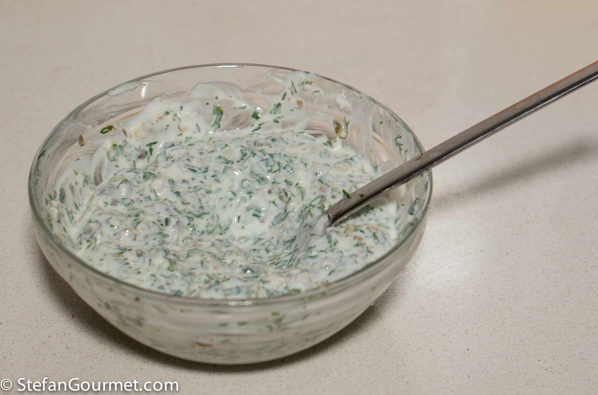 …then add the yogurt, salt, and pepper, and mixed well. It is best to make this in advance and allow the flavors to marry in the refrigerator. Take out the sauce about half an hour before serving, so it isn’t too cold.