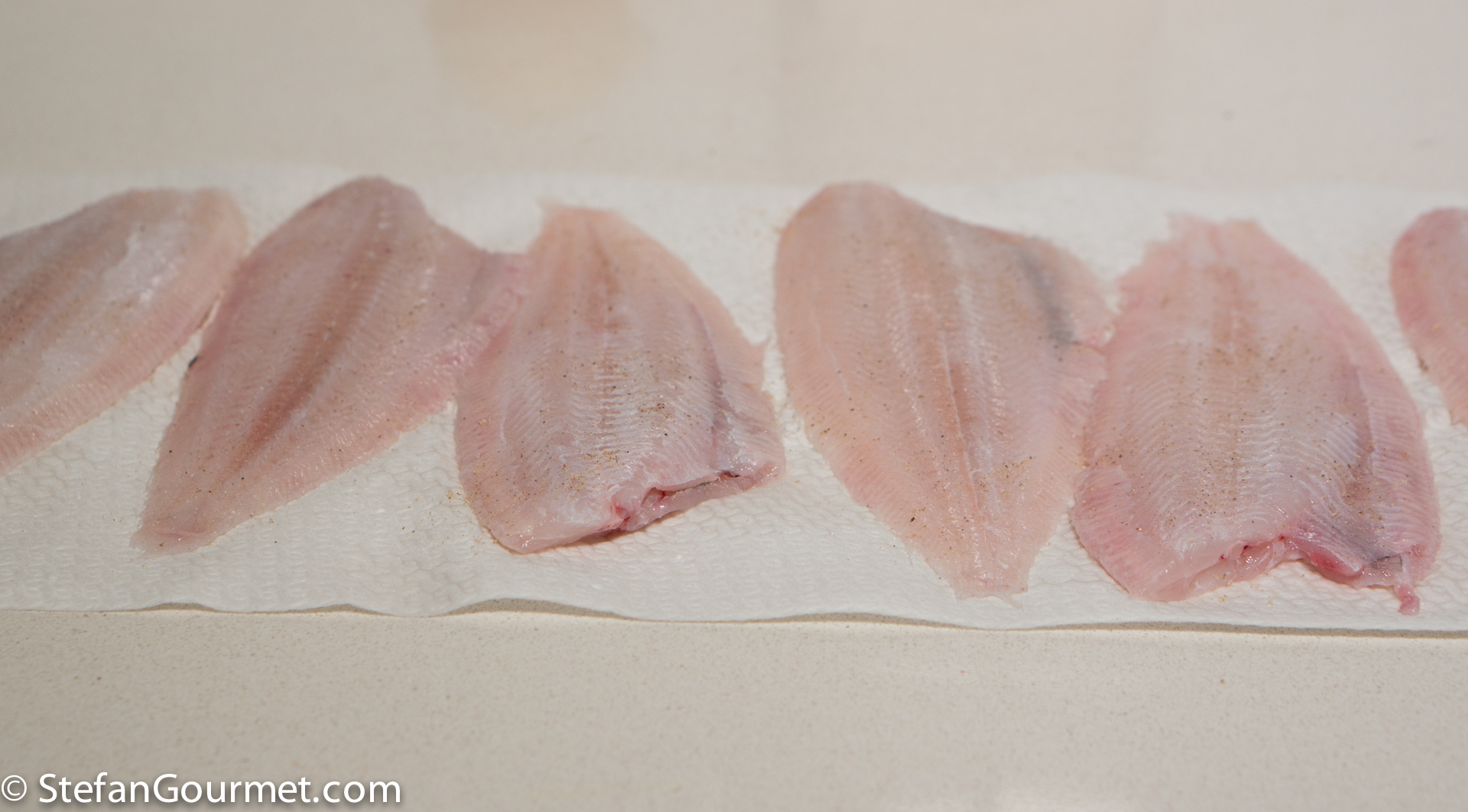 The sole should be skinned, gutted, and the heads removed. Pat them dry with paper towels, and season them on both sides with salt and freshly ground white pepper.