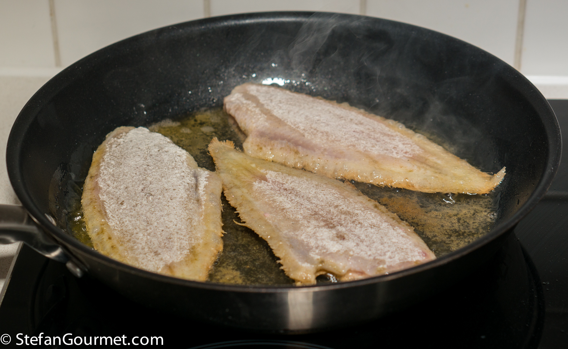The cooking time depends on the thickness. These baby sole took about two minutes per side. As always, do not overcook the fish. Insert a fork in the thickest part to check. If the fork comes out warm, the fish is cooked.